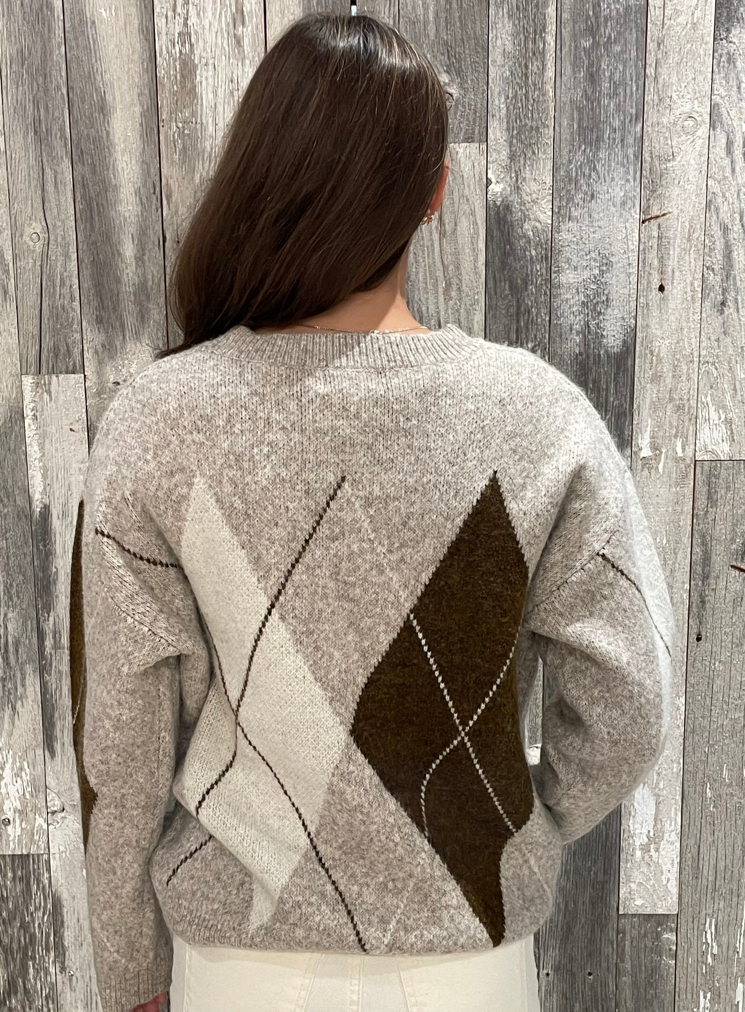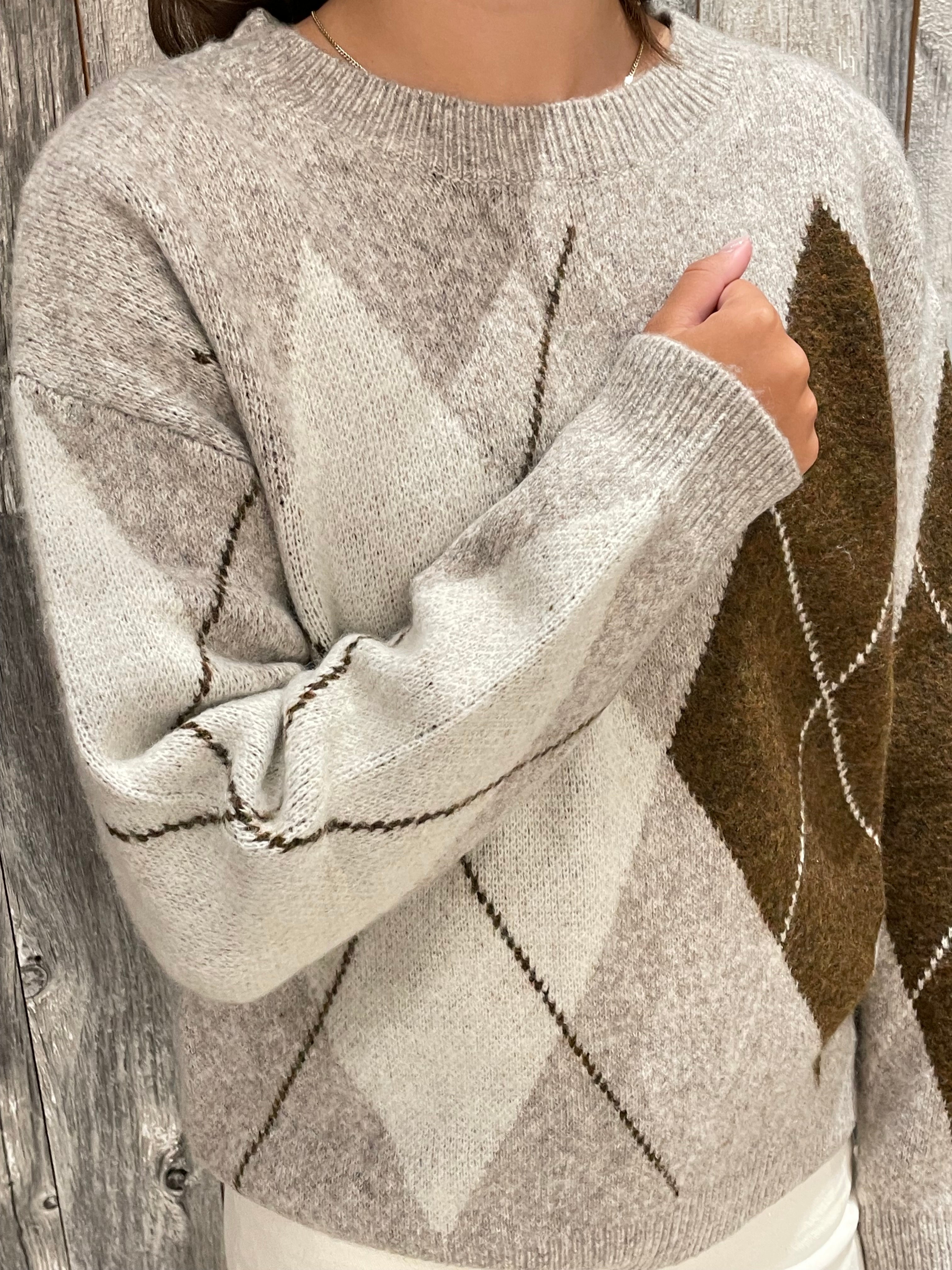 Pattern/Colors: Heather oatmeal base with oversized diamonds in ivory, taupe, and deep olive/brown; contrast stitched lines