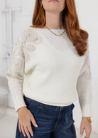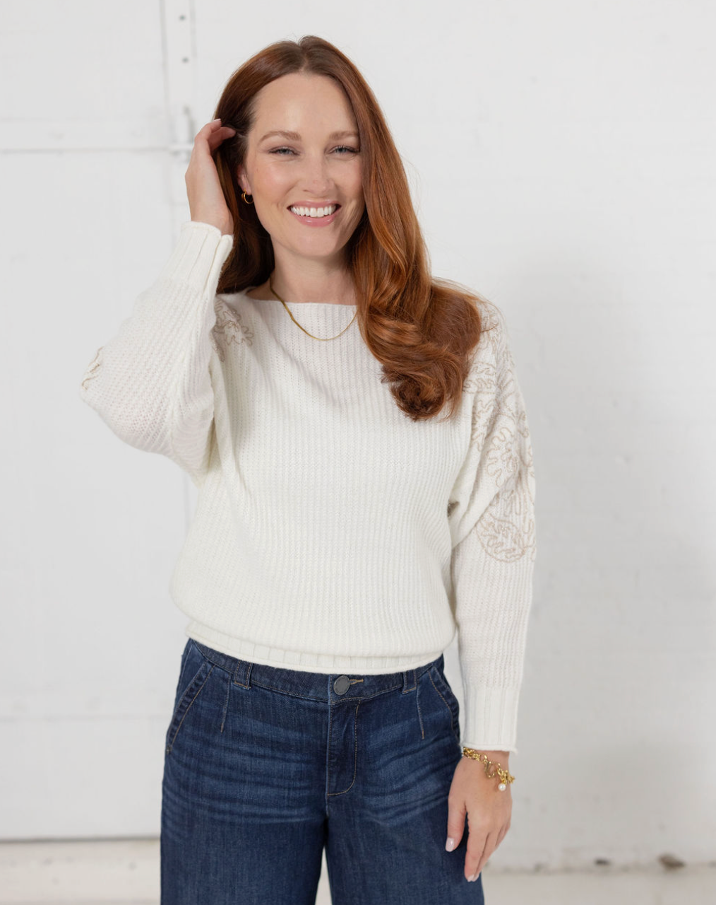 Cozy up in style with this cream knit sweater featuring beautiful embroidered floral detailing on the shoulders and sleeves ✨