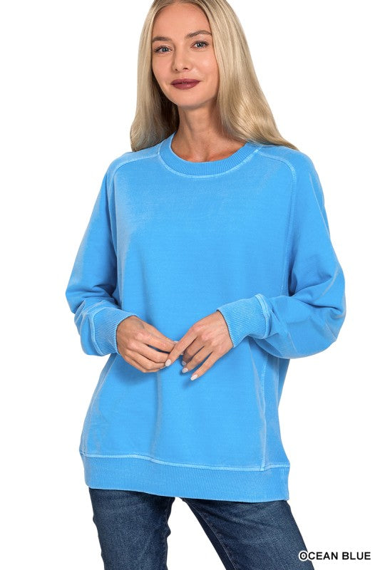 Meet your new everyday essential. This ocean blue mineral wash sweatshirt features a perfectly relaxed oversized fit with drop shoulders and wide ribbed trim for that cozy-but-polished vibe. The washed finish gives it a soft, lived-in look you’ll wear on repeat—pair with denim, leggings, or your favorite joggers.