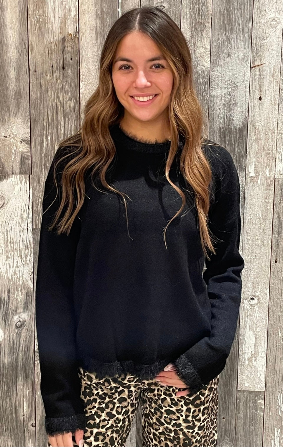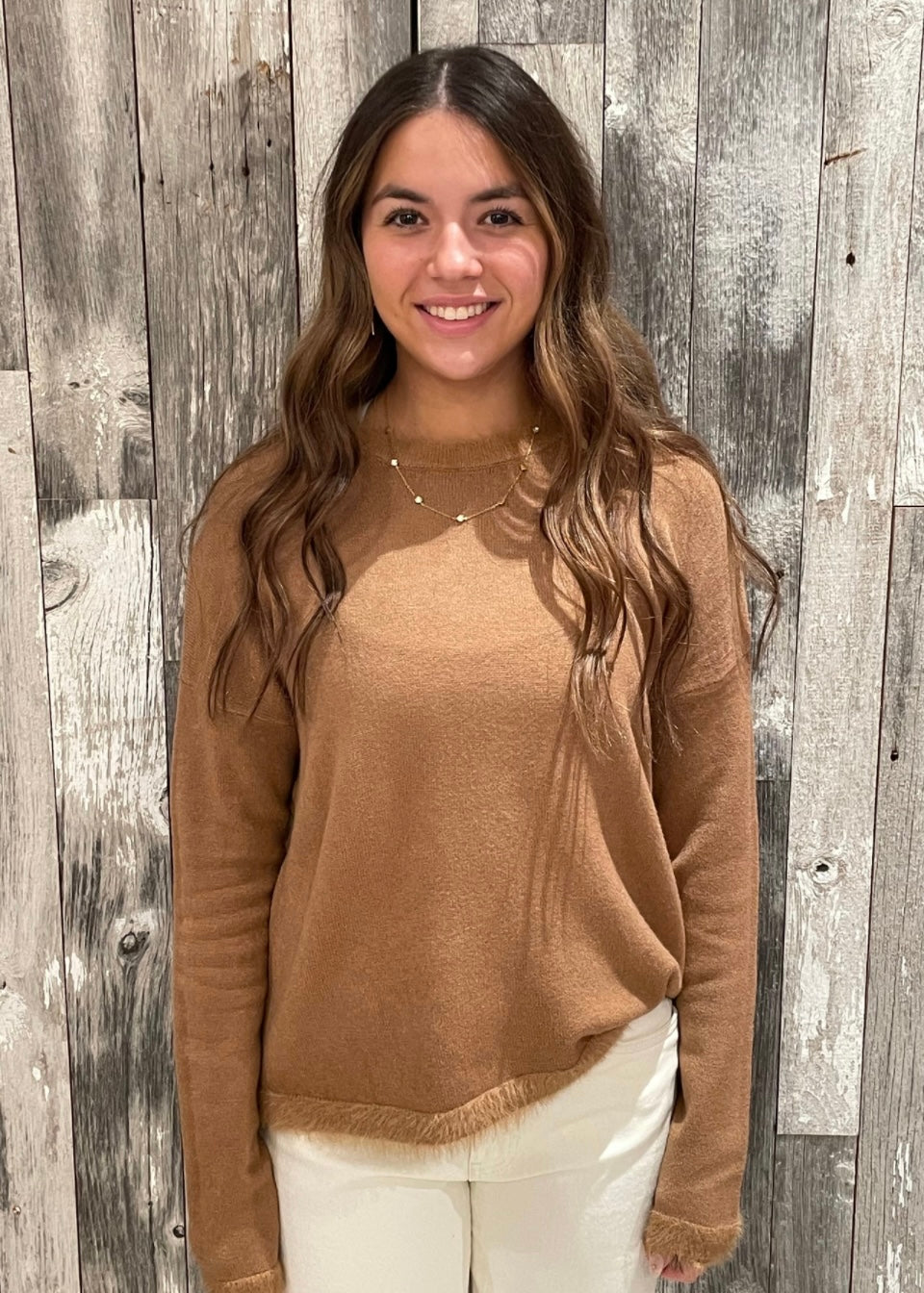 Soft, stylish, and just a little bit playful — our Fuzzy Trim Sweater adds the perfect touch of flair to your cold-weather wardrobe. Designed with a cozy knit body, this sweater features eyelash-soft fuzzy trim along the neckline, sleeves, and hem for a chic, elevated look that still feels effortless.