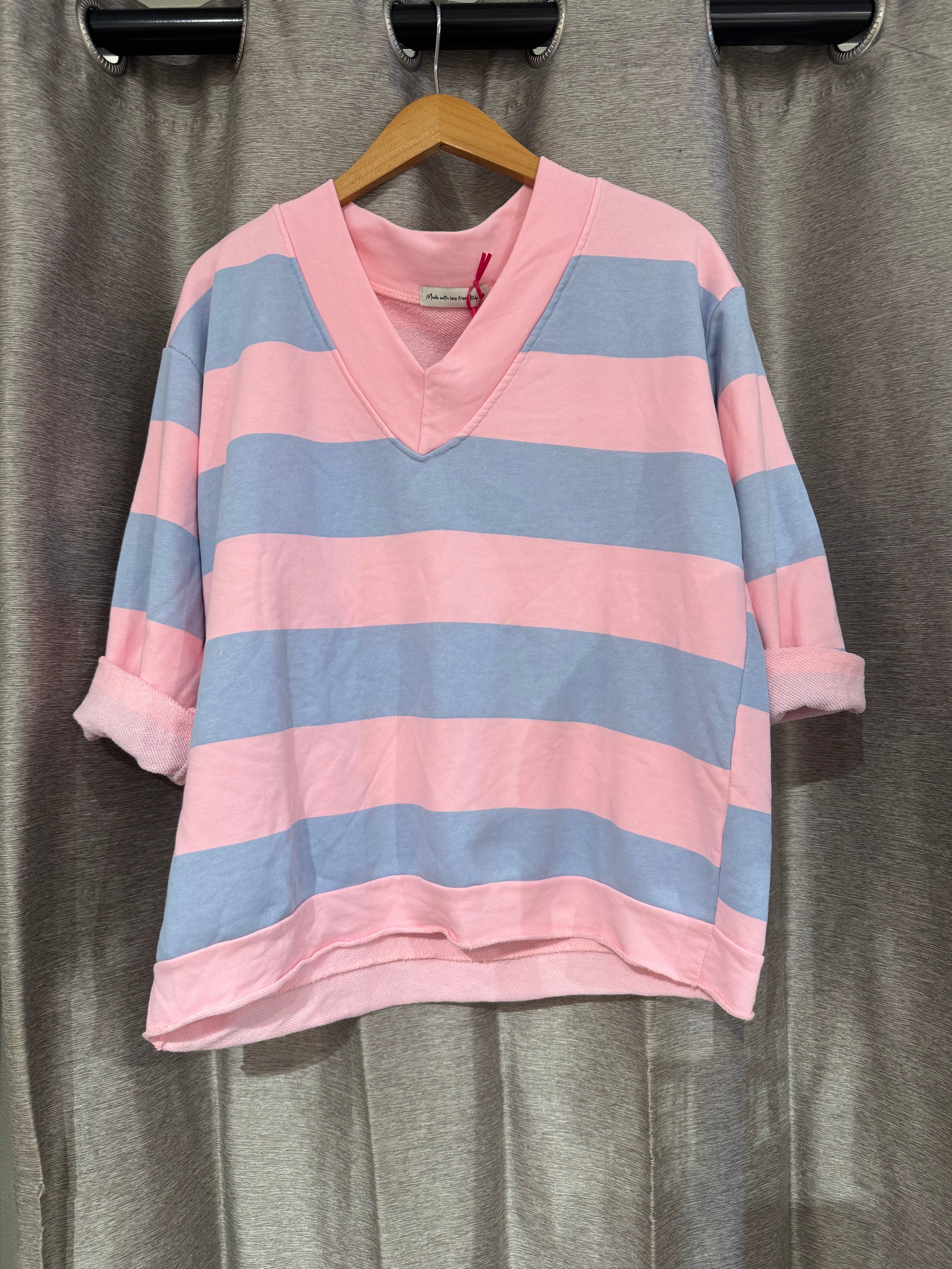 This striped V-neck top is comfy, cute, and casually polished all at once. With soft pastel pink and blue stripes and an easy relaxed fit, it’s the kind of everyday women’s top that feels laid-back but still totally put together.