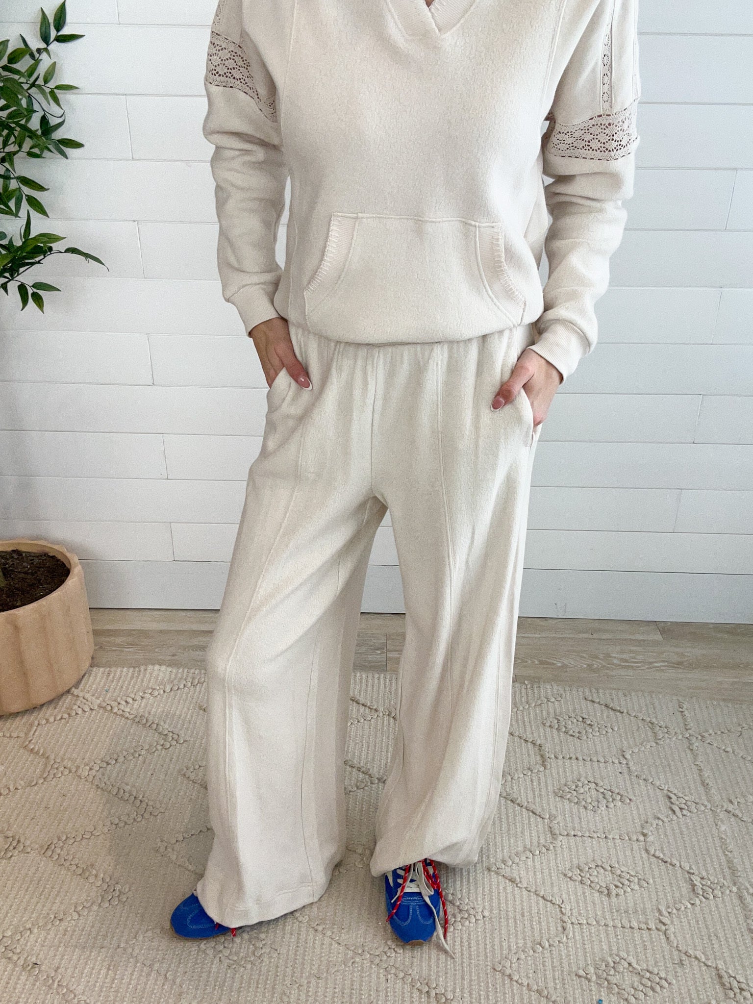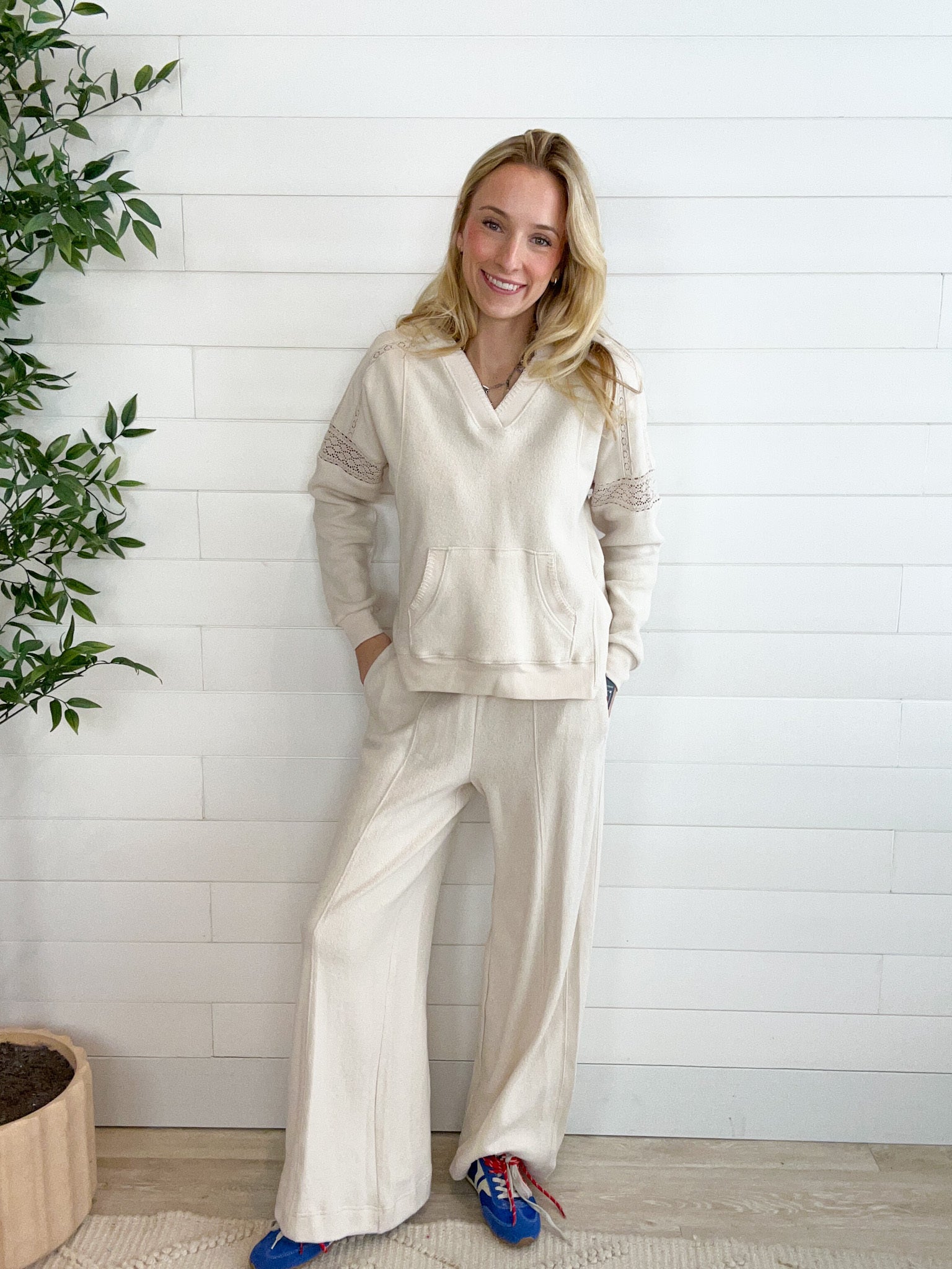 This neutral V-neck hoodie sweater is the perfect blend of casual comfort and thoughtful design. Crafted in a soft knit with subtle texture, it features delicate lace-style detailing along the shoulders and sleeves that instantly elevates the look. The relaxed fit and kangaroo pocket keep it laid-back and wearable, while the V-neckline adds a flattering, feminine touch. Easy, versatile, and effortlessly chic — this is one of those pieces you’ll reach for again and again.