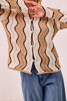 This cozy, vintage-inspired sweater brings effortless charm to your fall wardrobe. Designed with a unique wavy knit pattern and color-blocked sleeves, it’s a versatile piece that can be worn as a pullover or reversed as a button-up cardigan. The relaxed fit and lightweight feel make it ideal for layering, whether you’re pairing it with high-waisted denim or a skirt for a chic, casual look.