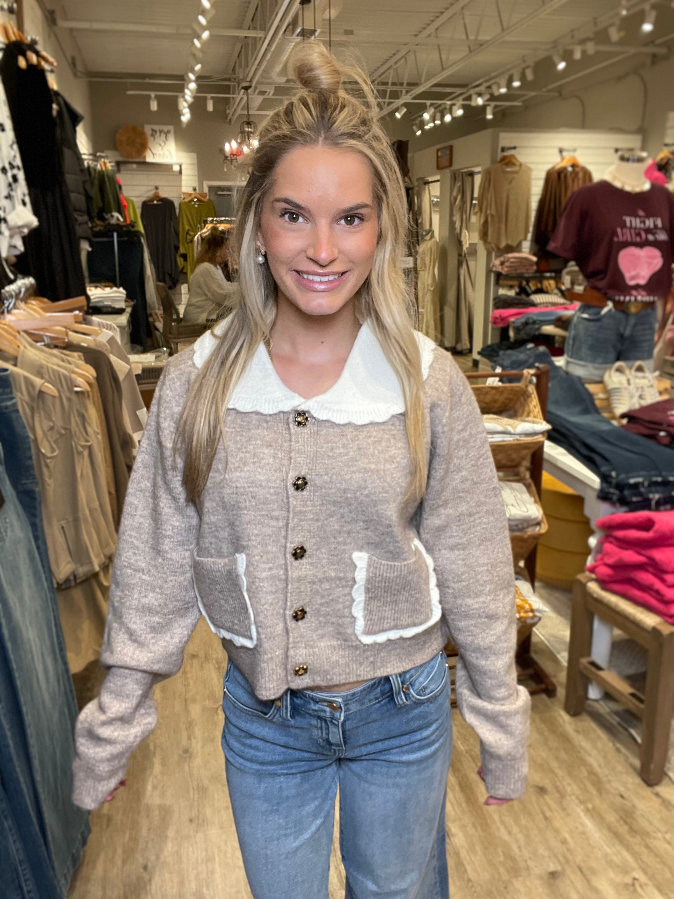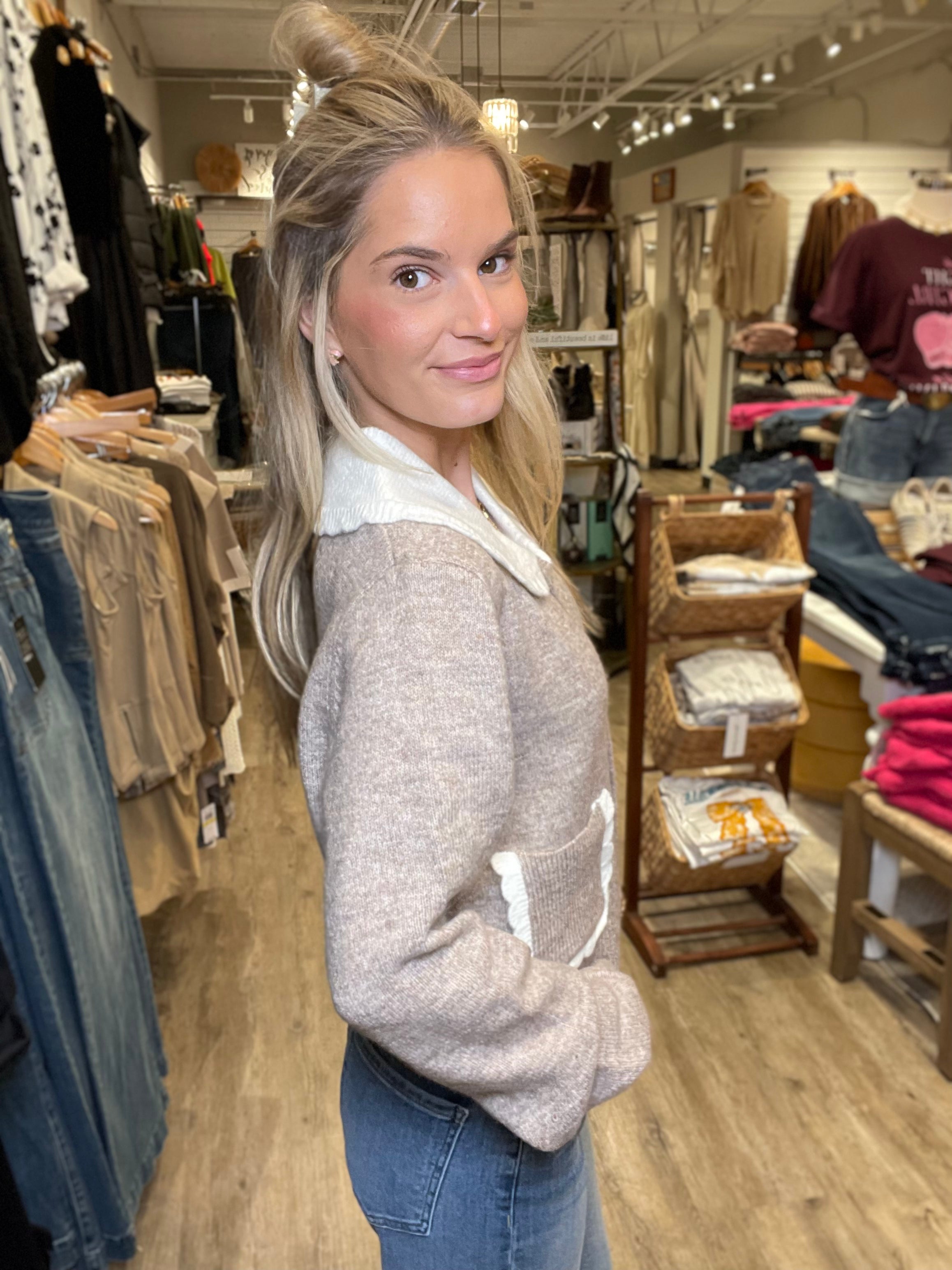 Two front patch pockets, each trimmed with matching white scalloped edges