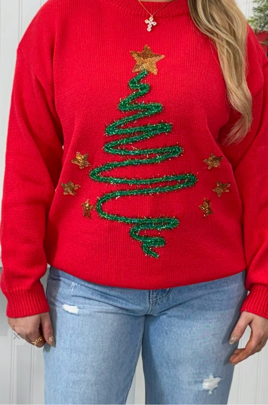Get into the holiday spirit with this cozy and cheerful red Christmas sweater! Featuring a sparkling Christmas tree design with star accents, this oversized sweatshirt adds a playful touch of festive charm to your winter wardrobe. Perfect for parties, family gatherings, or just staying cozy at home.