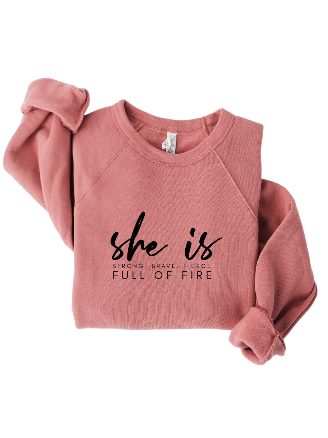 “She Is Strong. Brave. Fierce. Full of Fire.” graphic text