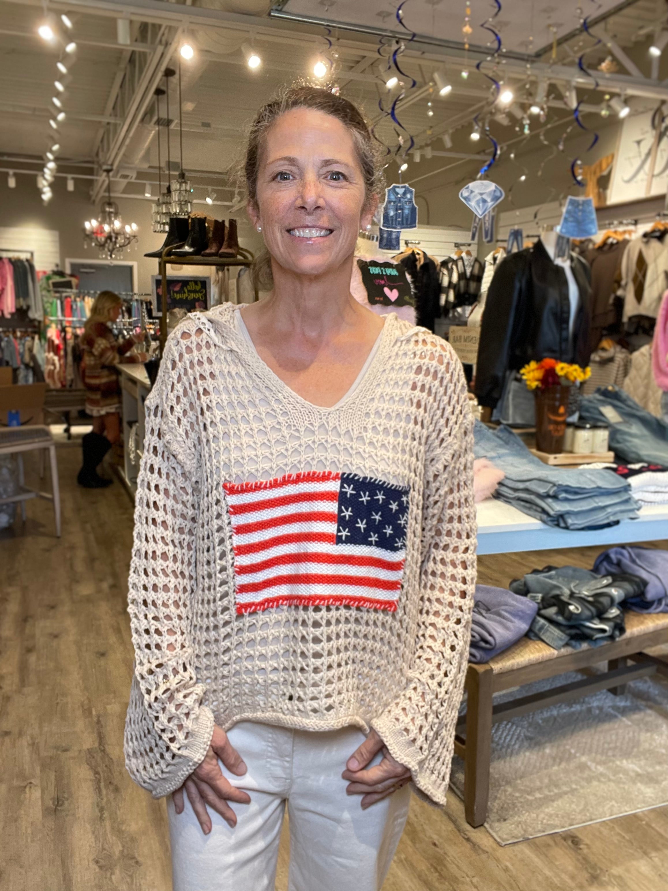 Add a touch of Americana charm to your wardrobe with this open-knit crochet sweater. Crafted in a natural beige hue, this lightweight pullover features wide sleeves, a relaxed fit, and a bold American flag detail at the chest for a statement look. Perfect for layering over tanks, bralettes, or swimsuits, it’s the ultimate boho-chic piece that transitions seamlessly from casual daytime wear to breezy festival nights.