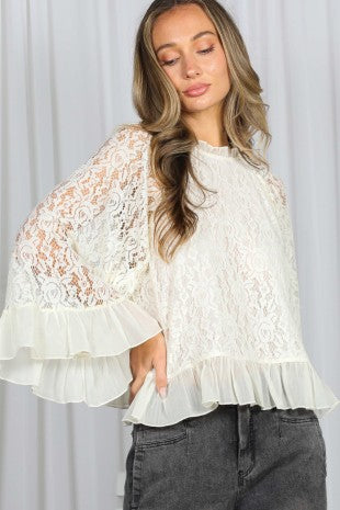 3/4 Bell Sleeves And A Ruffle Hem Lace Blouse