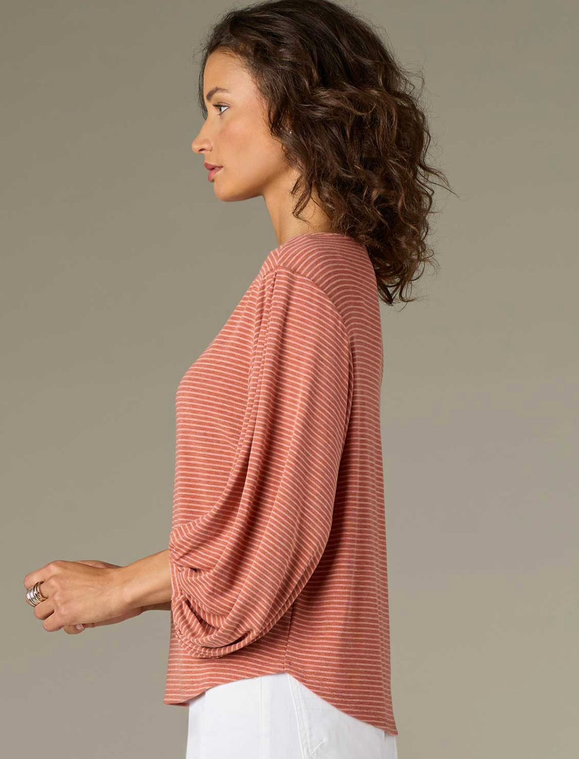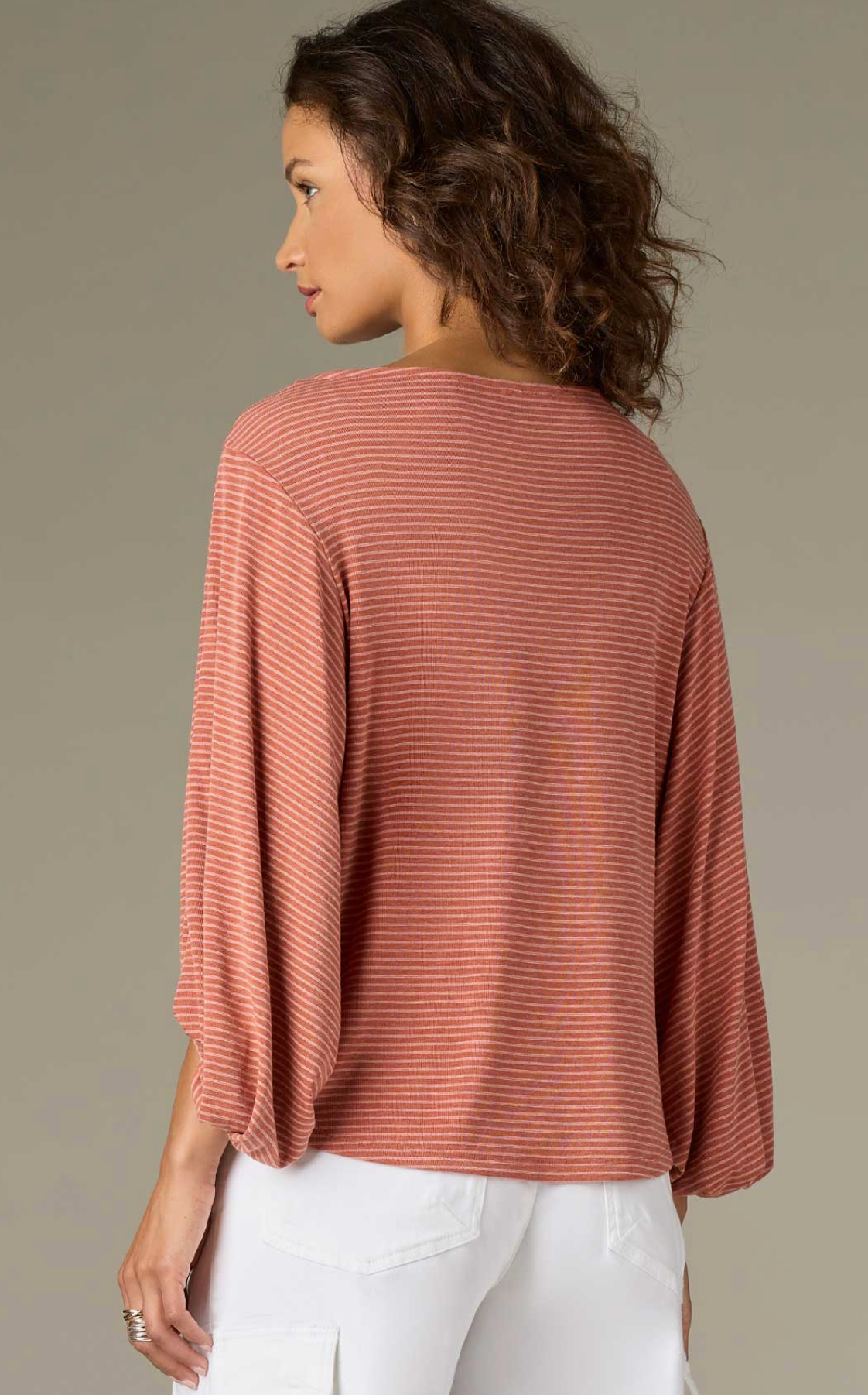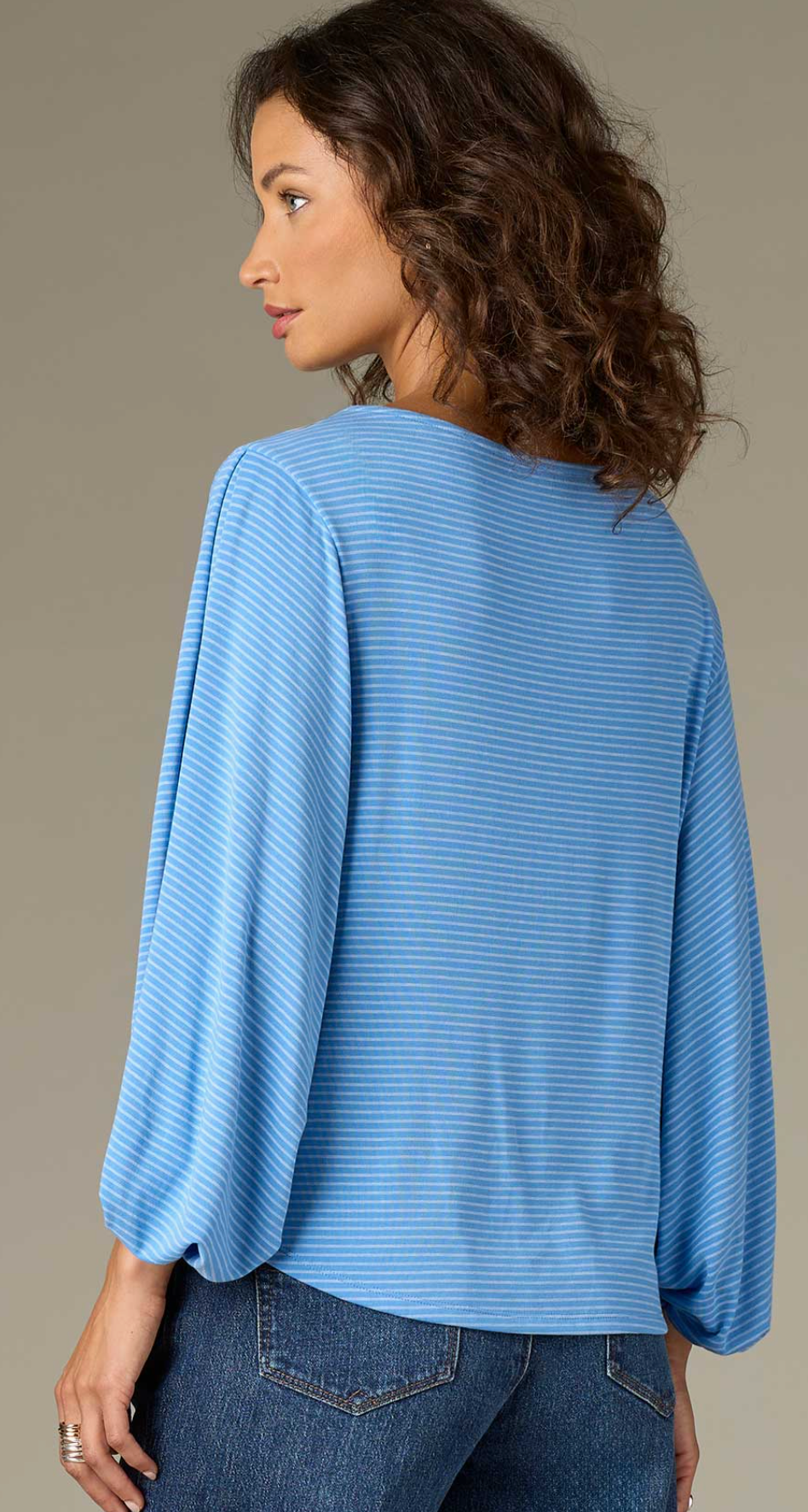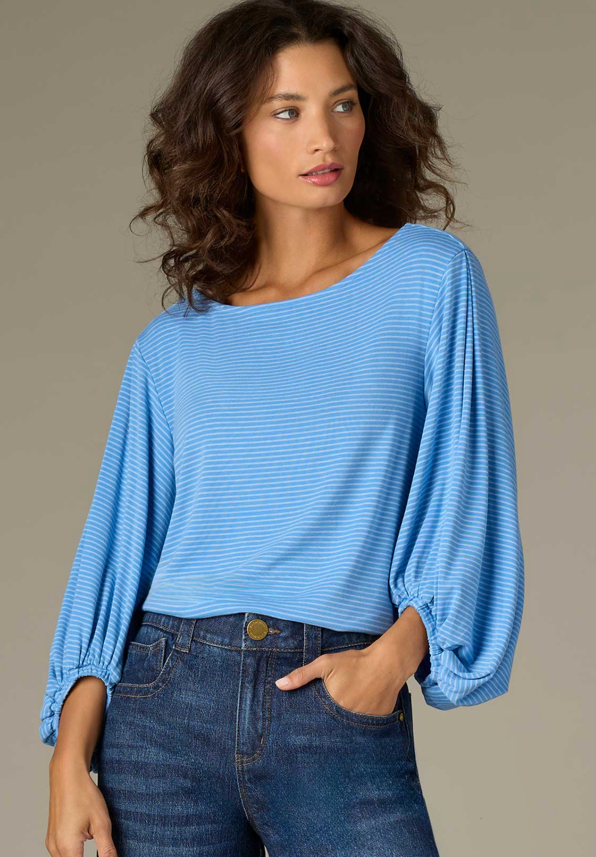 Three Quarter Blouson Sleeve Boat Neck Striped Knit Top