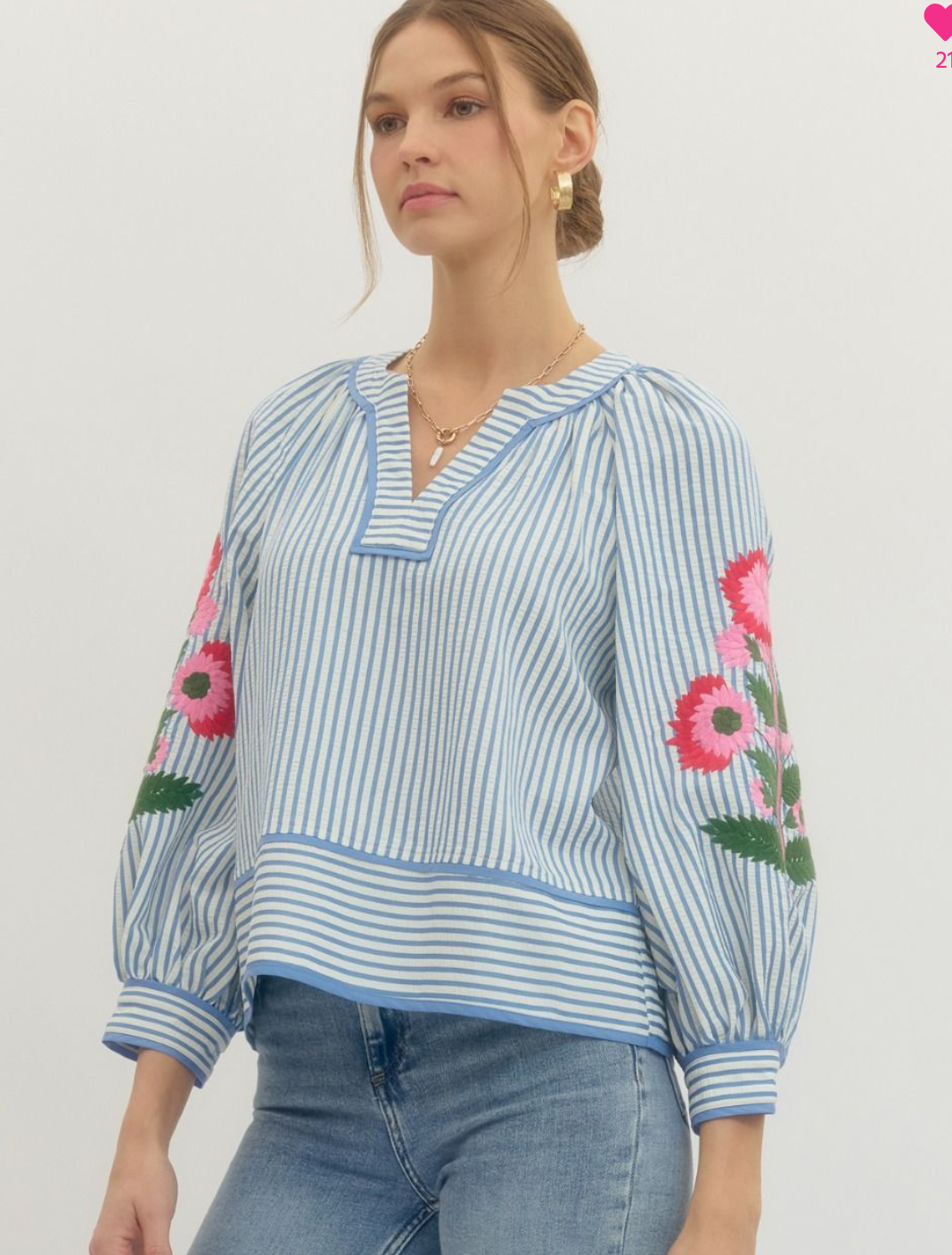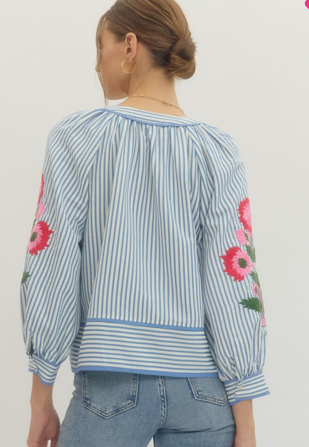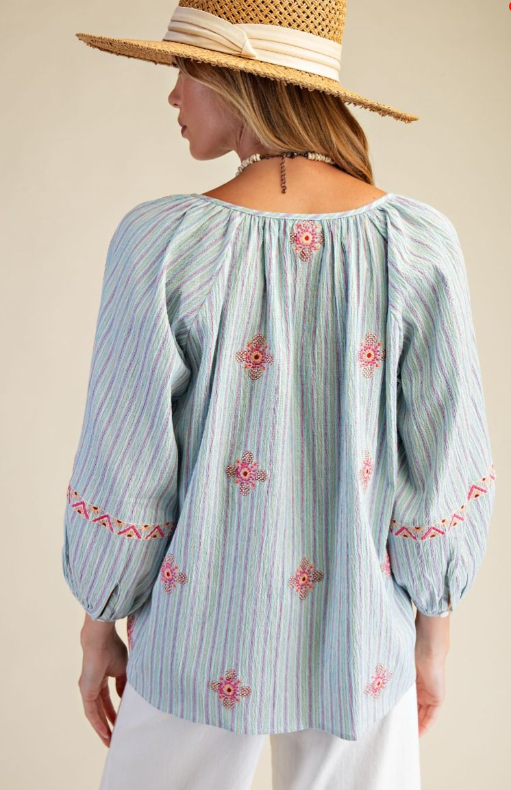 Striped 3/4 Sleeve W/Embroidery & Stripes