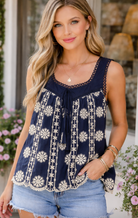 This navy embroidered tank is pure charm with a timeless twist. Featuring delicate ivory floral embroidery, scalloped lace trim straps, and a sweet tie-front detail, it’s the kind of top that instantly elevates your warm-weather wardrobe. Lightweight and breezy with a relaxed, feminine fit, it’s perfect for sunny days, casual dinners, and everything in between.