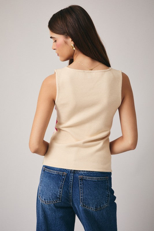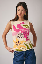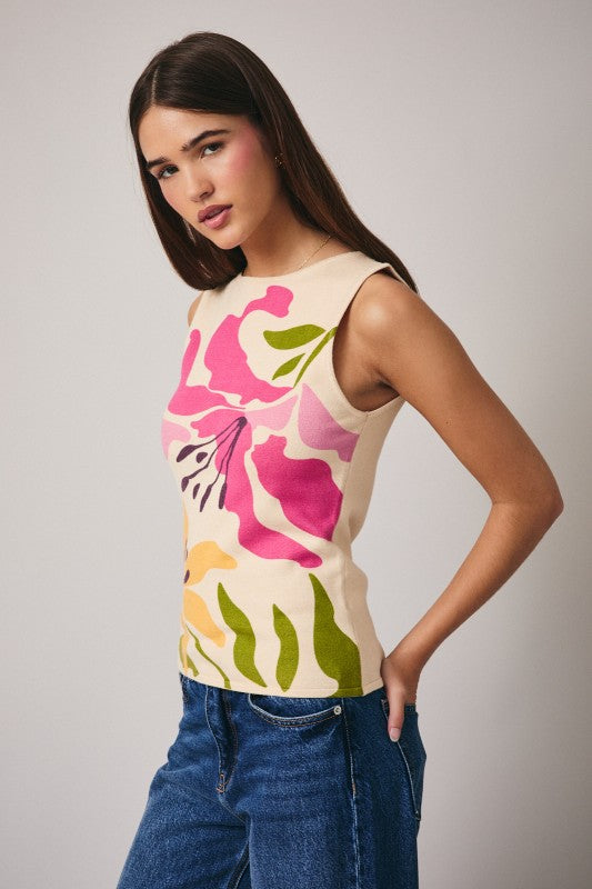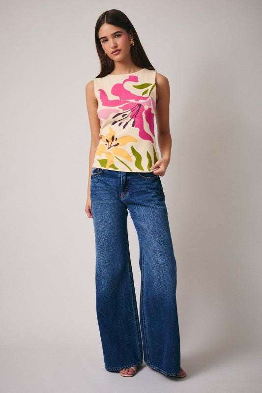 This sleeveless floral knit tank is sunshine in outfit form. With its playful oversized blooms and soft neutral base, it brings that artsy, feel-good vibe while still being totally wearable for everyday. The clean crew neckline and tailored-yet-comfy fit make it an easy win for women’s fashion lovers who want something fun but polished. It’s colorful without being loud — aka the kind of top you’ll reach for again and again.