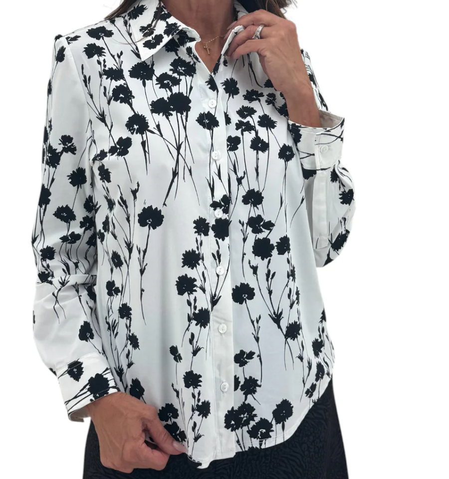 Elegant and effortless, the Floral Silhouette Button-Up Blouse brings modern charm to a timeless classic. Featuring an artistic black floral print on a crisp white background, this blouse combines sophistication with ease. The tailored collar and button-front design make it versatile for both work and weekend wear.