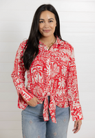 Say hello to your new statement-maker. This bold red tropical print button-down brings major resort vibes with an effortless, wear-anywhere feel. The tie-front detail adds a flattering twist, while the lightweight drape keeps things breezy and comfortable. It’s the kind of women’s fashion favorite that looks styled without trying — perfect for sunny days, casual Fridays, or vacation mode at home.