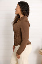 • Ruched detailing: Subtle ruching along the button placket adds texture and creates a flattering, slightly fitted silhouette.
