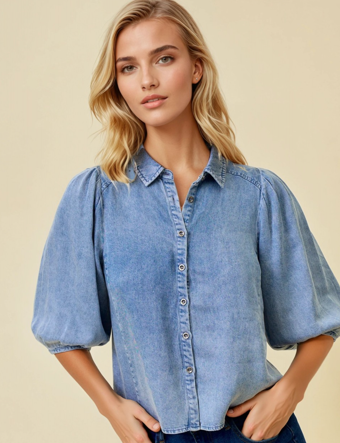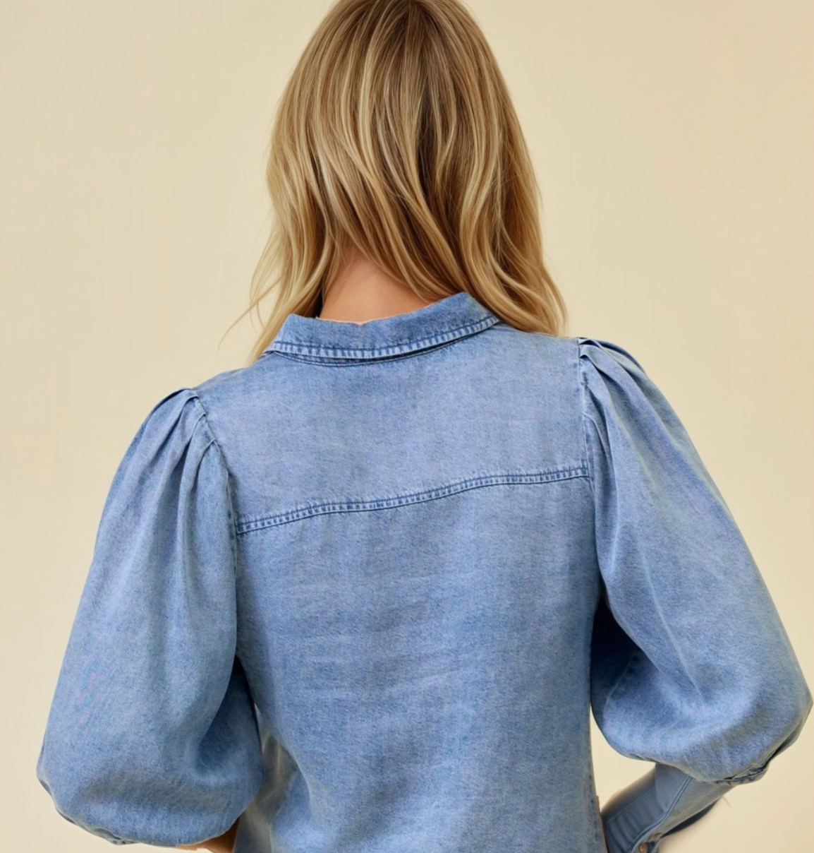 A fresh, feminine update to a classic denim shirt. This lightweight denim top features soft puff sleeves and a relaxed fit that’s easy to dress up or down. It’s the perfect blend of casual comfort and polished style.