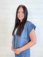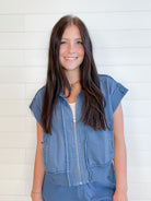 Power meets play in our Urban Edge Zip Vest. This sleeveless utility-style features a front zip closure, notched collar, raw-edged cap sleeves, and adjustable drawstring waist for a tailored yet relaxed fit. Finished in a soft washed blue cotton blend, it delivers laid-back attitude with effortless structure β ideal for everyday cool.