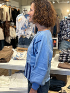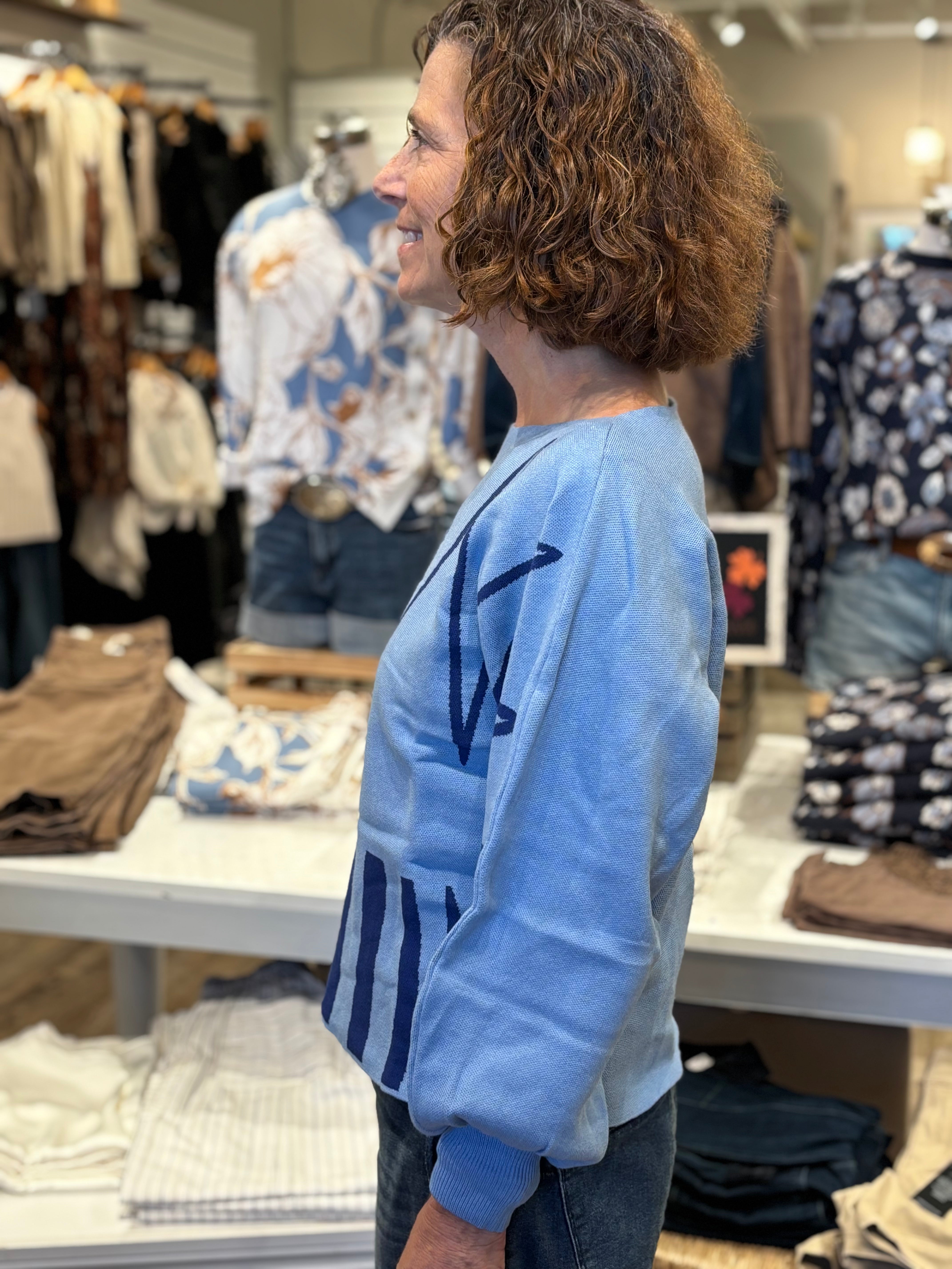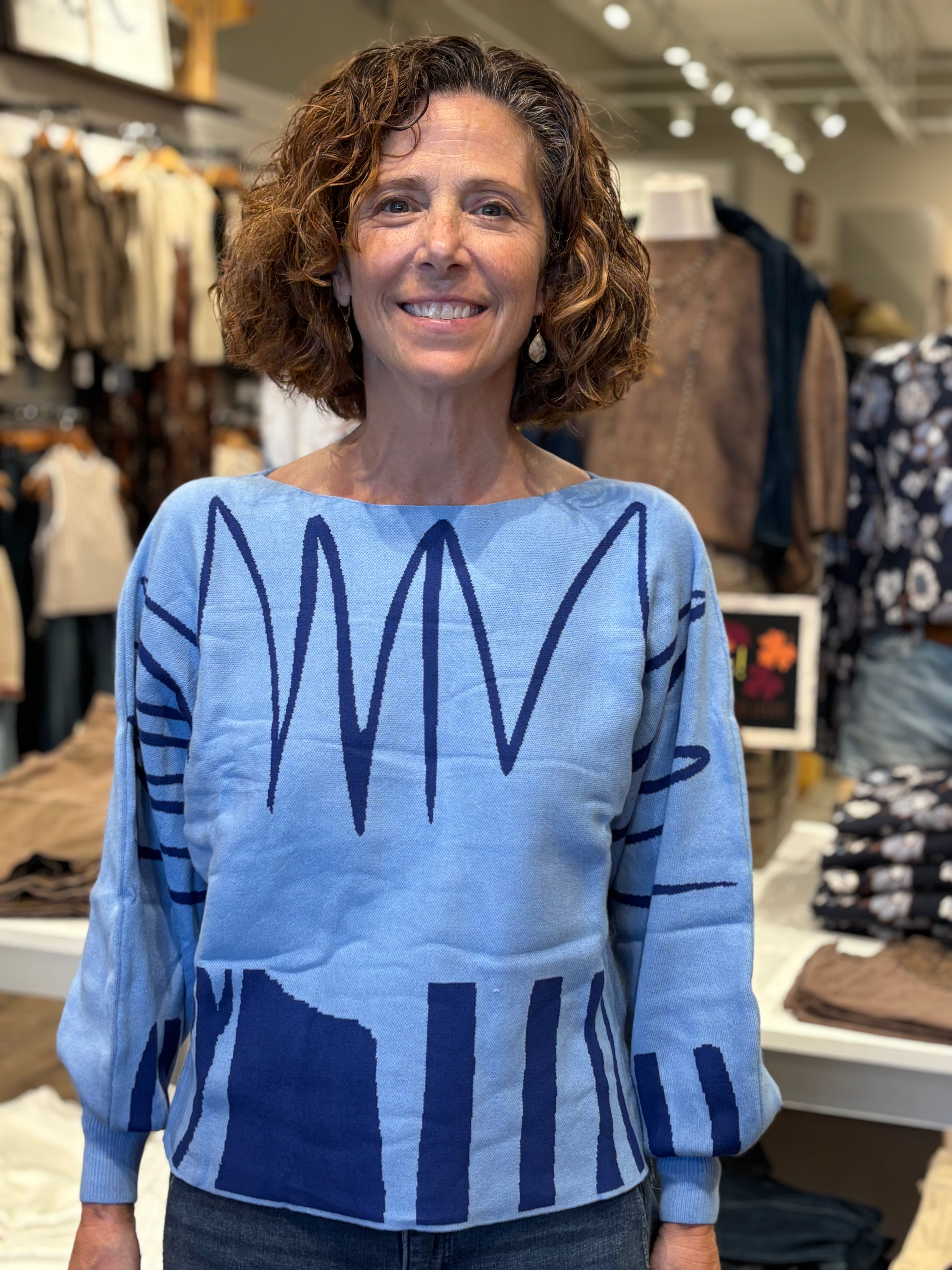 Cozy meets chic in this bold abstract sweater. Designed in a soft blue knit with striking deep cobalt wave patterns, it features an off-the-shoulder neckline for a relaxed yet stylish silhouette. The wide sleeves and slightly slouchy fit make it effortlessly comfortable while still fashion-forward. Pair it with jeans, skirts, or white pants for a statement-making casual look.