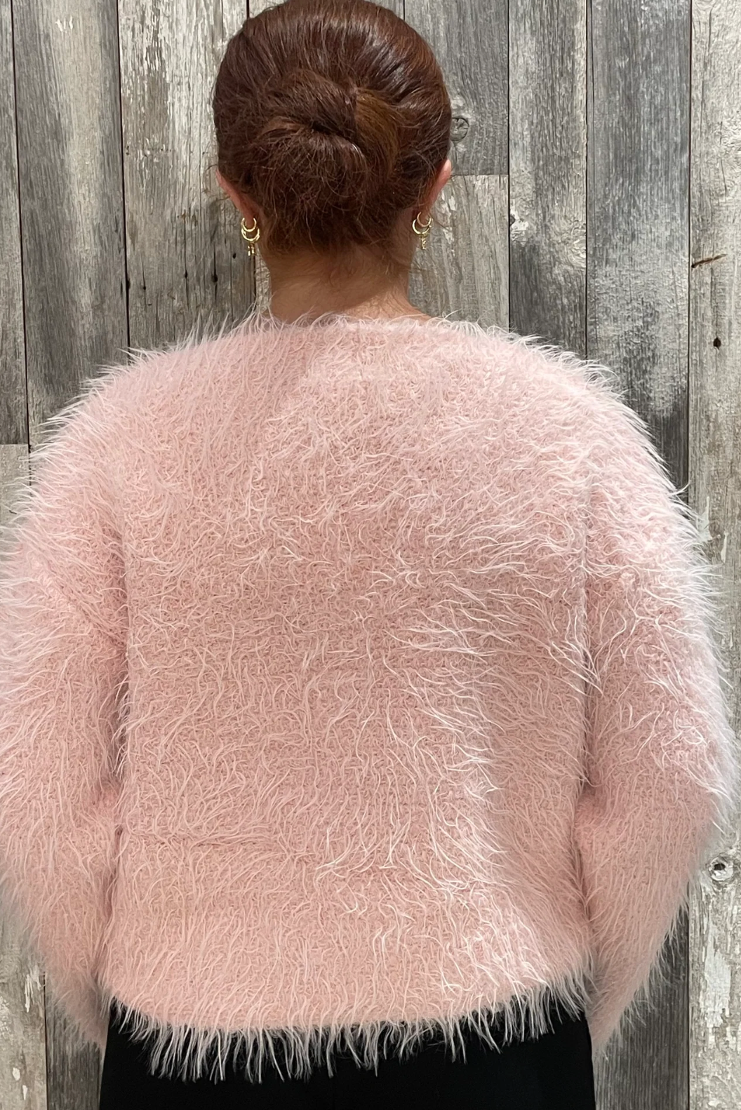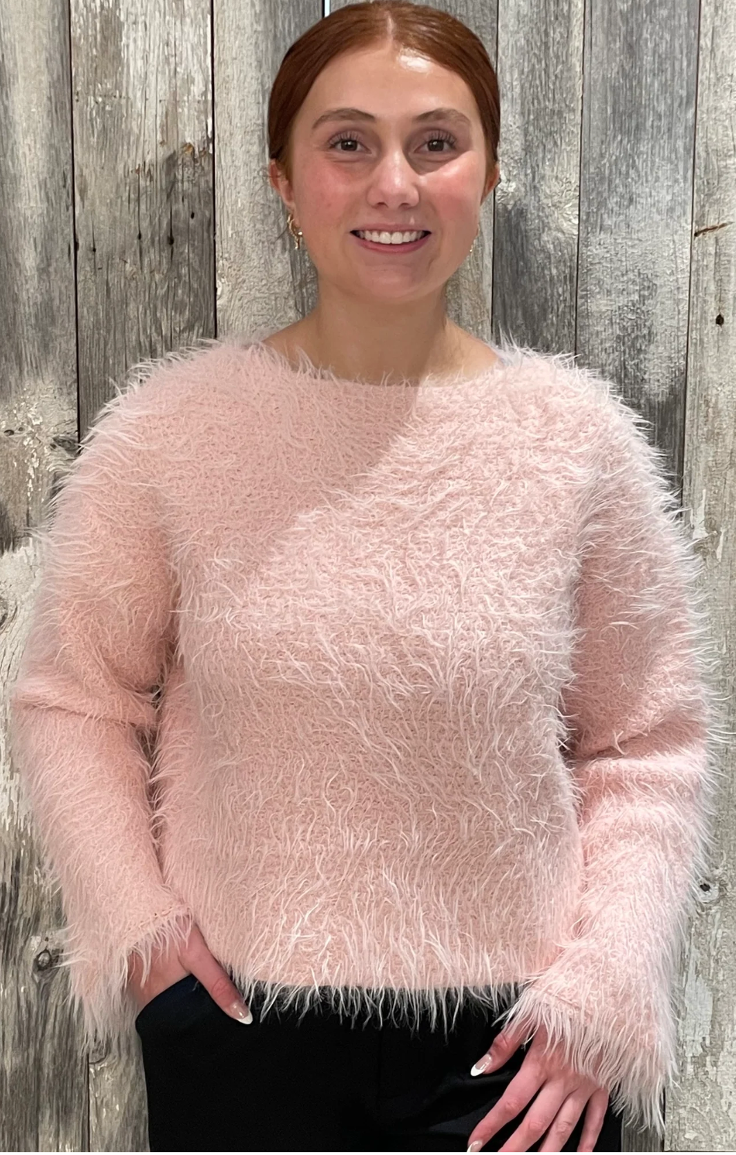 Wrap yourself in softness with this feathered fuzzy knit sweater in a delicate blush pink. The playful texture gives it a luxe, eye-catching feel while keeping it cozy and comfortable. Perfect for pairing with jeans, skirts, or trousers, this sweater is a statement piece that adds both charm and warmth to your fall and winter wardrobe.
