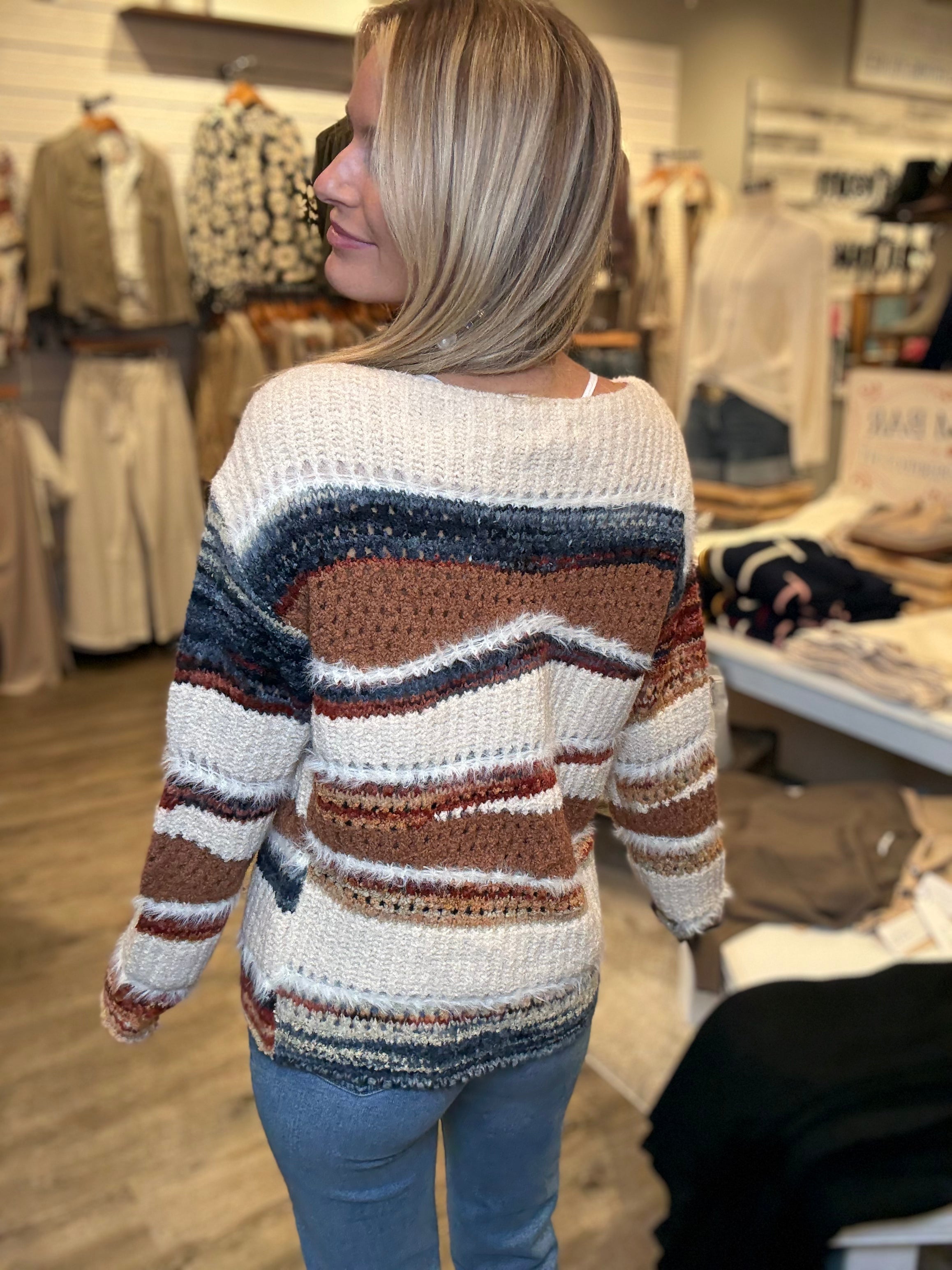 Charlie B’s Mixed Knit Striped Sweater blends cozy comfort with artful design. Each stripe is a unique mix of color and texture—soft, organic, and a little bit playful—woven together in warm neutrals with a subtle pop of mauve. The result is a sweater that feels both timeless and refreshingly modern, perfect for slow mornings, crisp walks, or casual evenings out.