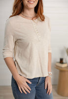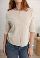 Henley Neckline: Classic round neckline with a partial button placket for a casual yet refined style.