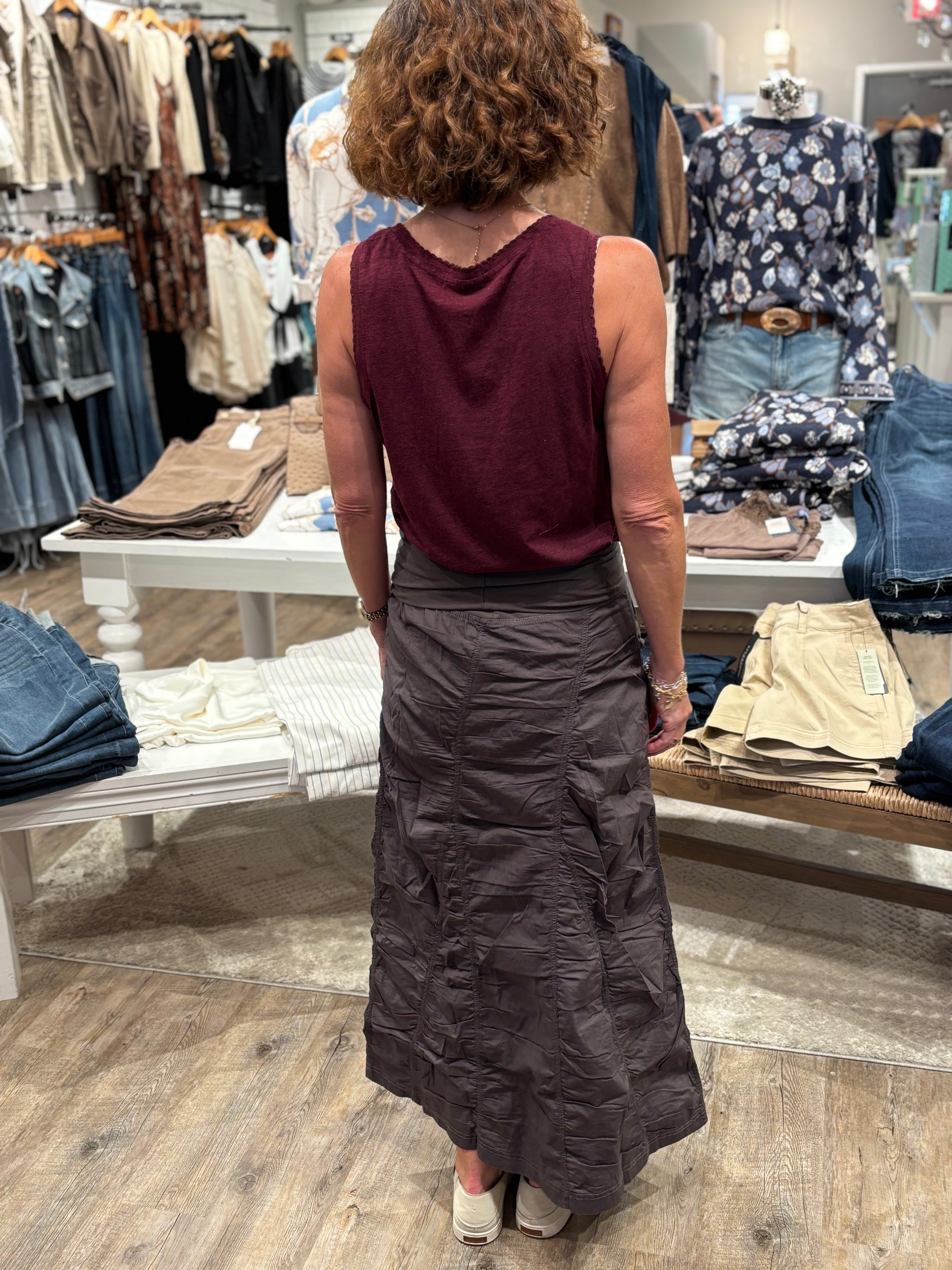 Effortlessly chic and flattering, this ruched midi skirt is designed to move with you while keeping its shape. Featuring all-over ruched paneling for a textured look, this skirt offers a sleek silhouette with a touch of edge. The wide elastic waistband ensures all-day comfort and an easy pull-on fit. Perfect for dressing up or keeping casual, this skirt transitions seamlessly from day to night.