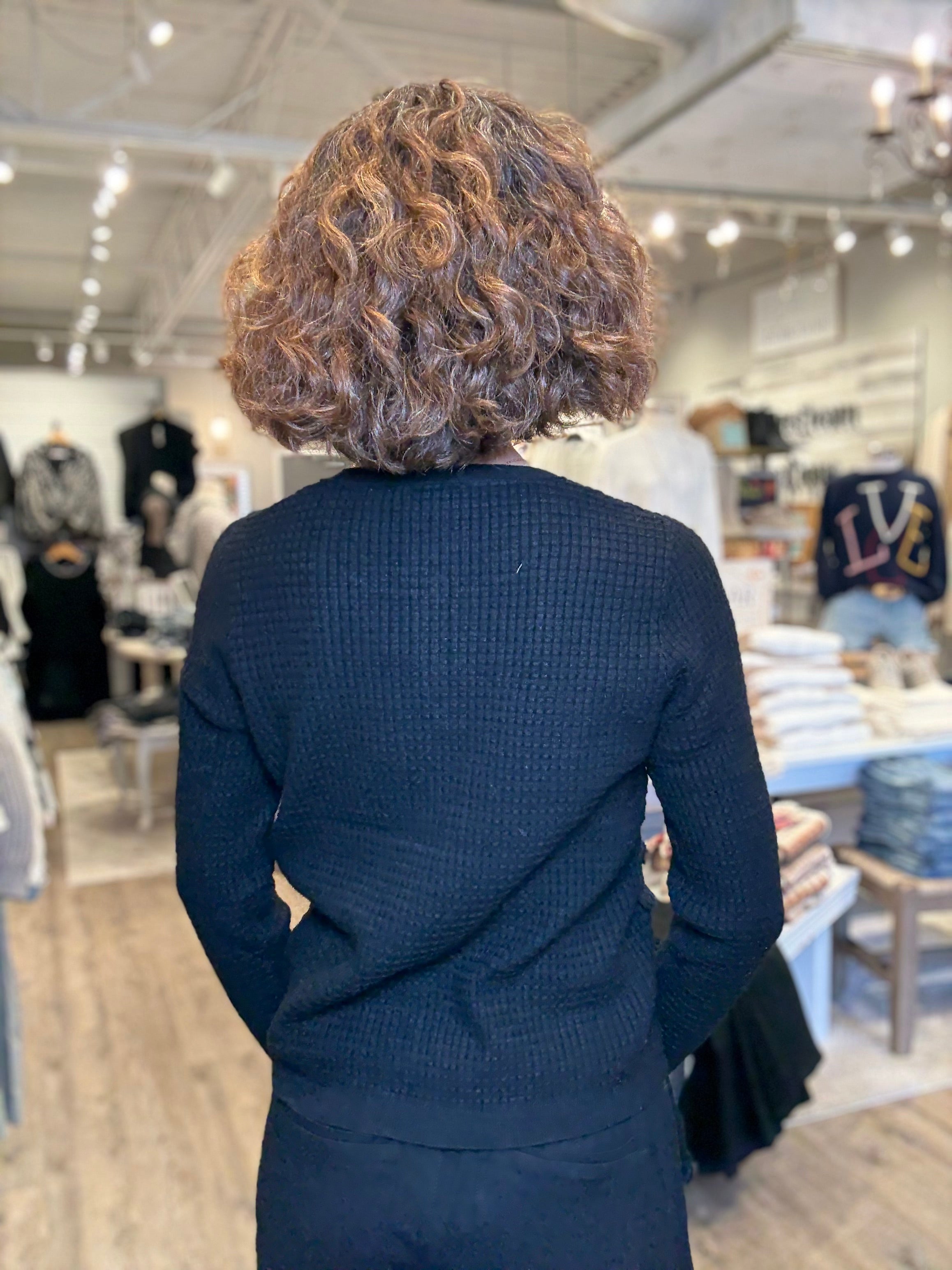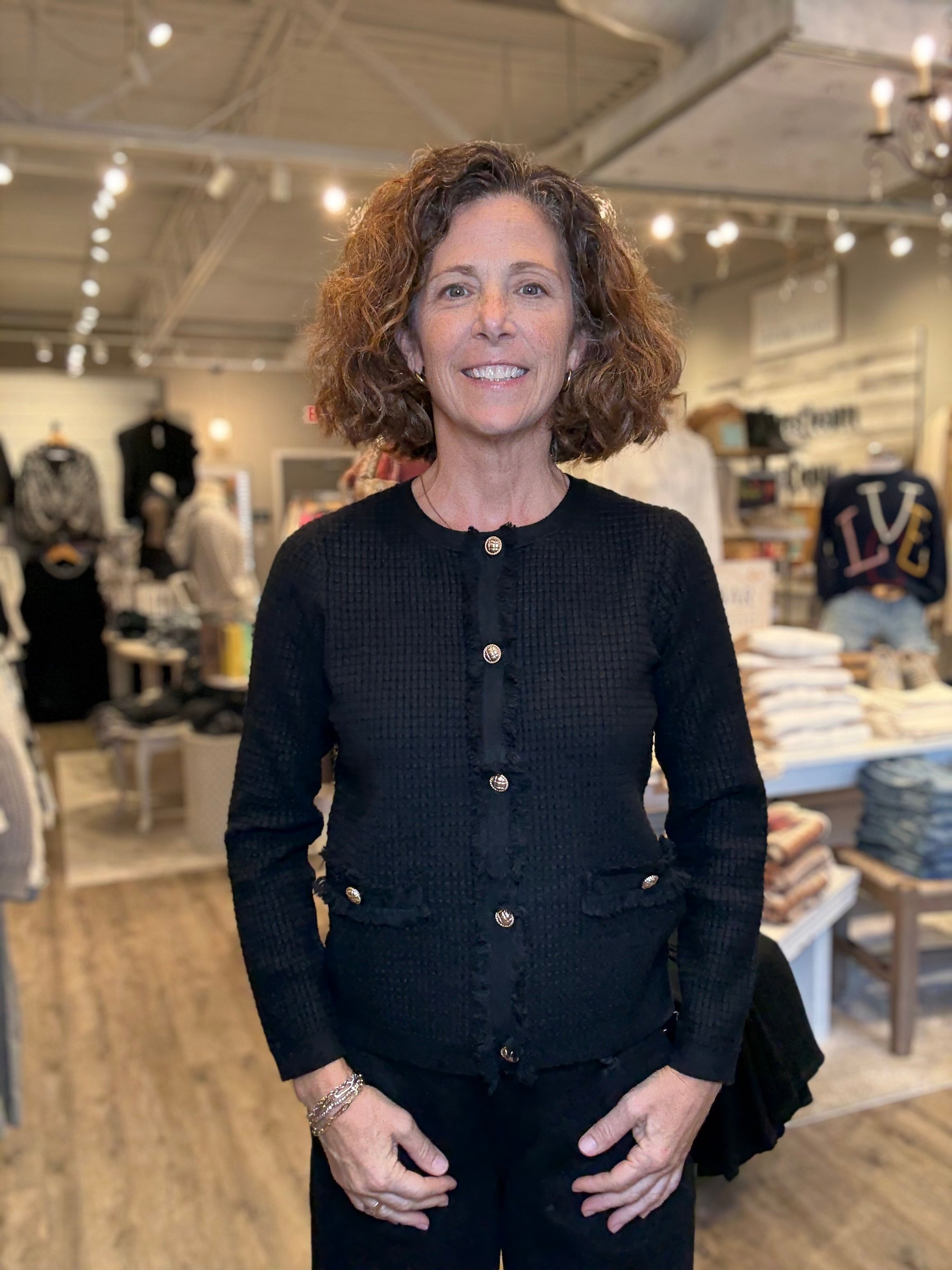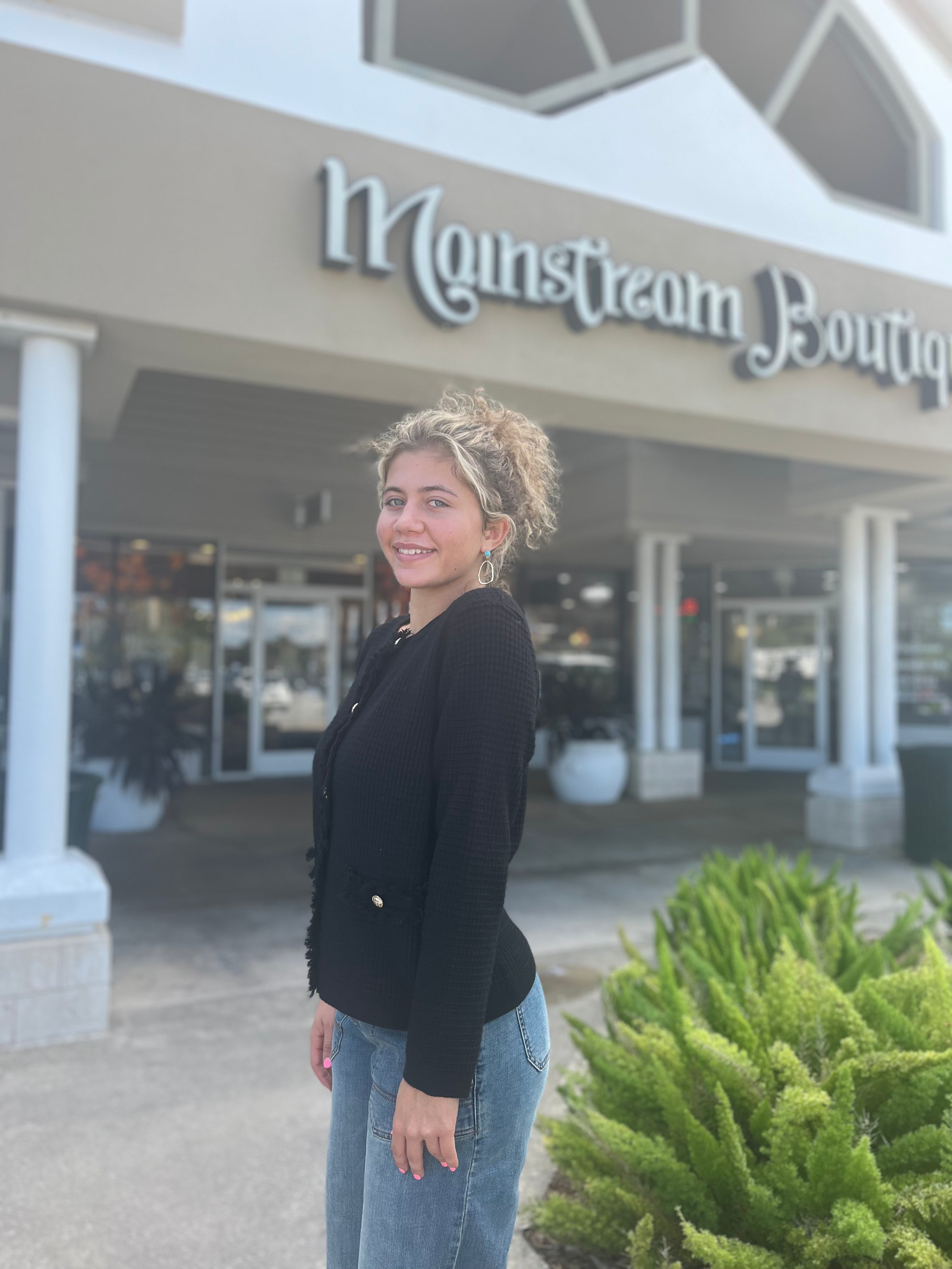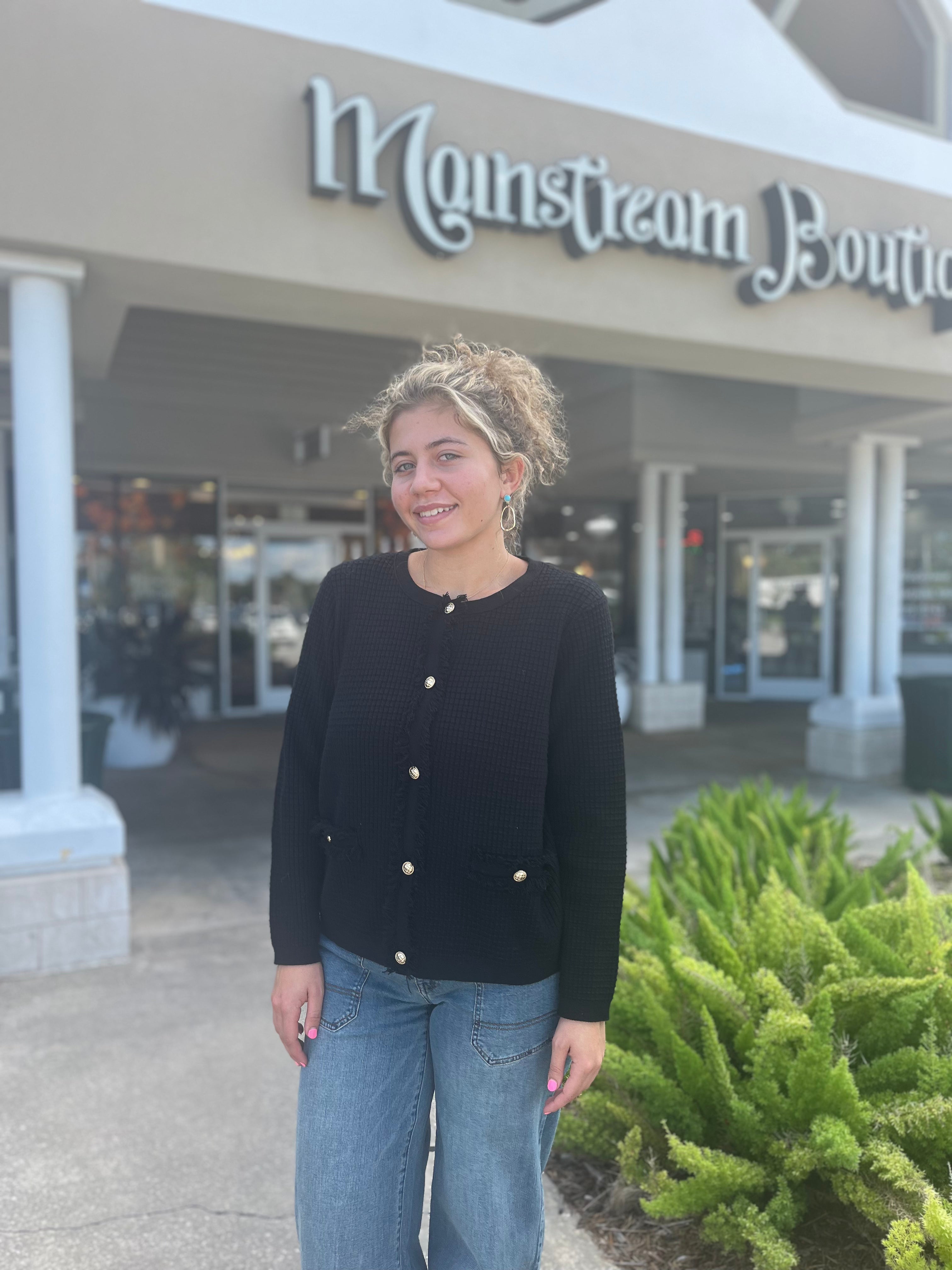 You can never go wrong with a timeless black cardigan — especially one with gold button detailing! 🖤