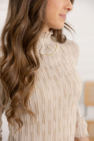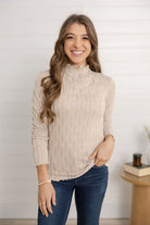 Add subtle sophistication to your everyday wardrobe with our Textured Mock Neck Long Sleeve Top. Crafted in a soft neutral beige, this lightweight knit features a delicate diamond-textured pattern for added dimension. The mock neck and lightly ruffled edges at the collar, cuffs, and hem give this piece a feminine, elevated feel.