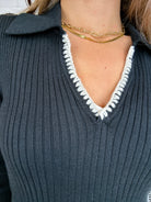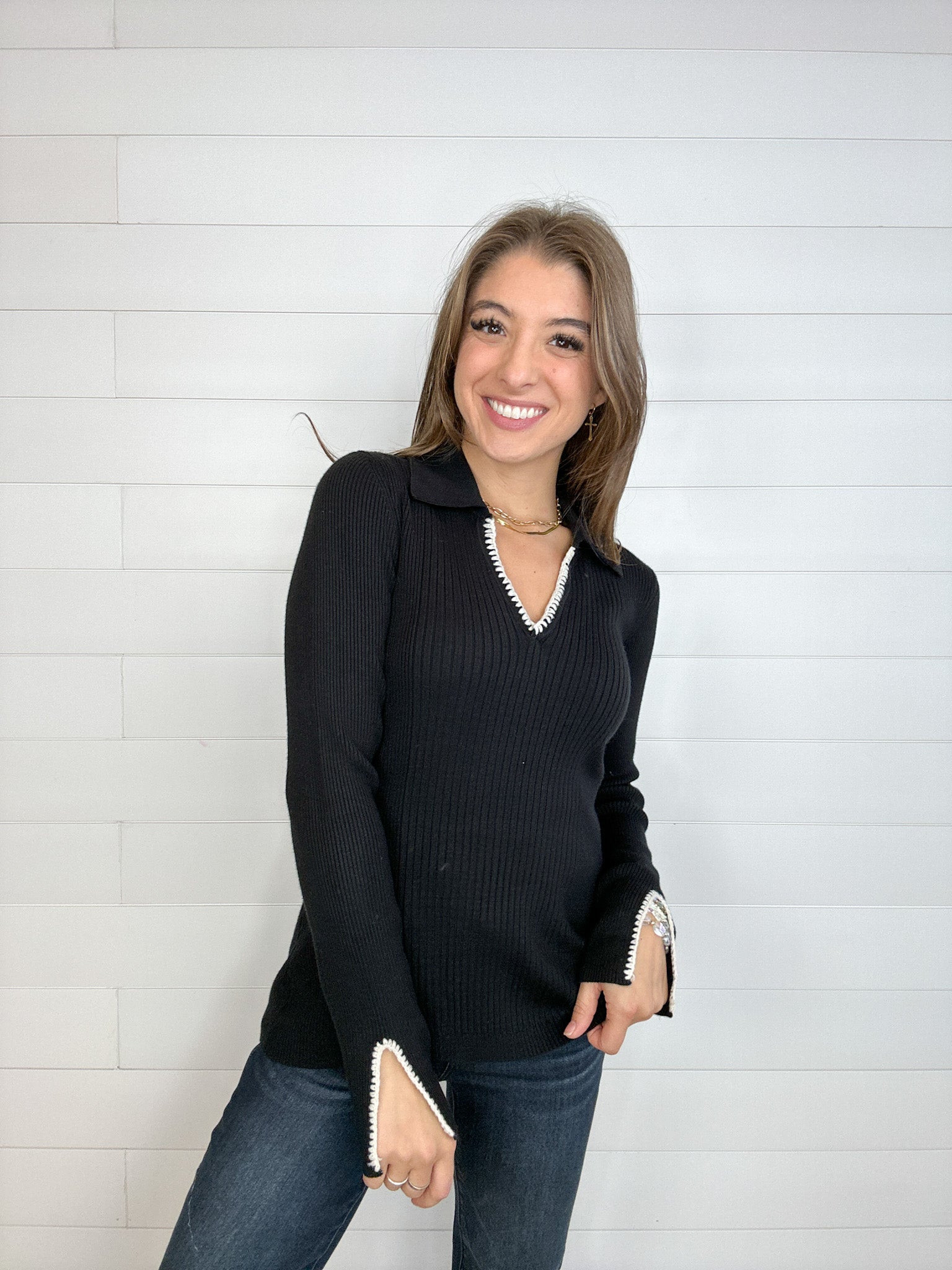 From our private MB line, this polo sweater is anything but basic. The ribbed knit hugs just right, while the open v-neckline flatters without the fuss of buttons. Contrasting crochet trim frames the neckline and split cuffs for that sweet little detail that sets it apart. Comfy, stretchy, and chic—this one’s an instant classic.