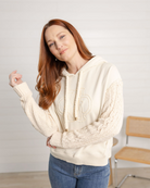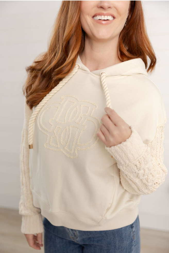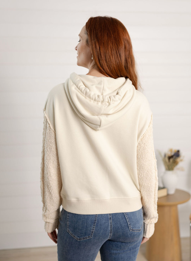 Fabric: Fleece body; cable-knit sleeves for contrast