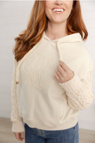 Front: Tonal embroidered/appliqué motif at chest; kangaroo pocket