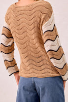 This cozy, vintage-inspired sweater brings effortless charm to your fall wardrobe. Designed with a unique wavy knit pattern and color-blocked sleeves, it’s a versatile piece that can be worn as a pullover or reversed as a button-up cardigan. The relaxed fit and lightweight feel make it ideal for layering, whether you’re pairing it with high-waisted denim or a skirt for a chic, casual look.