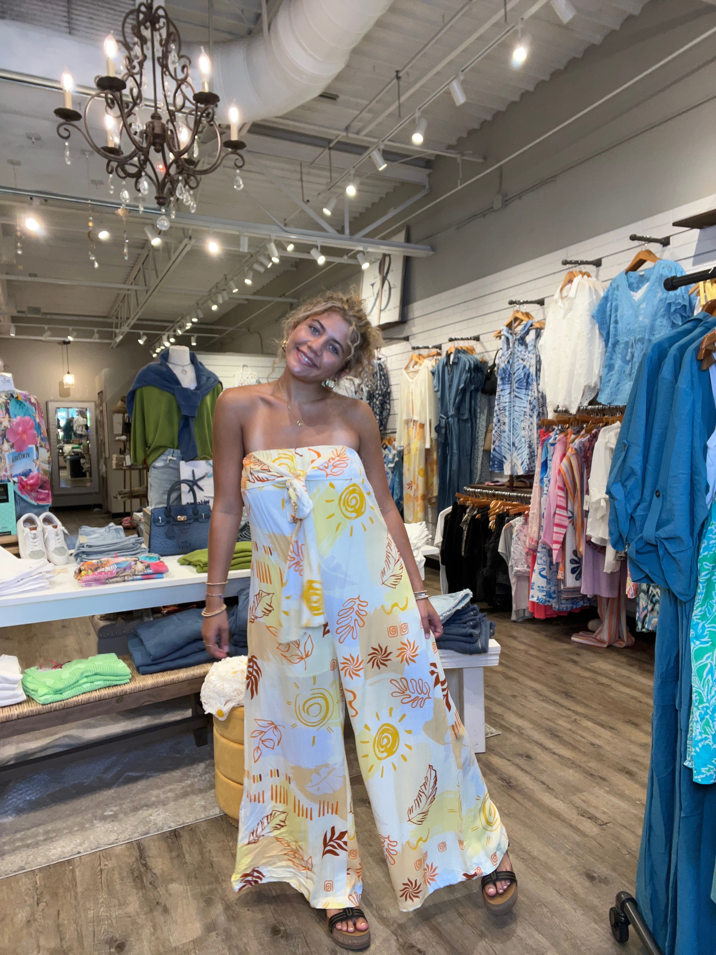 Bring the warmth of summer wherever you go with the Sunshine Strapless Jumpsuit, featuring a bold sun-and-leaf print that radiates fun and style. Its breezy silhouette and playful tie-front detail make it the perfect choice for sunny days, beach outings, or casual evenings.