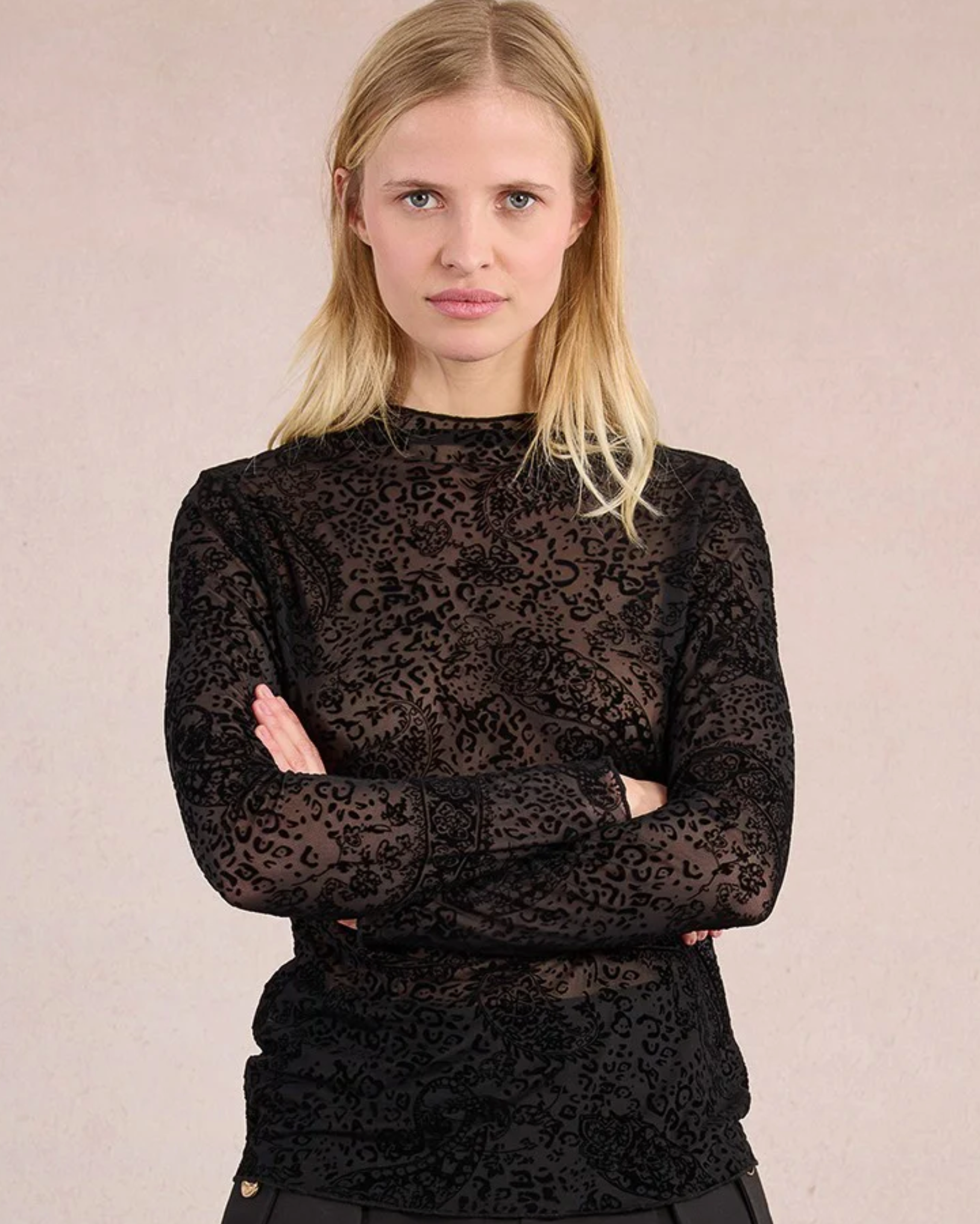 Sheer Black Flocked Mesh Long-Sleeve Top