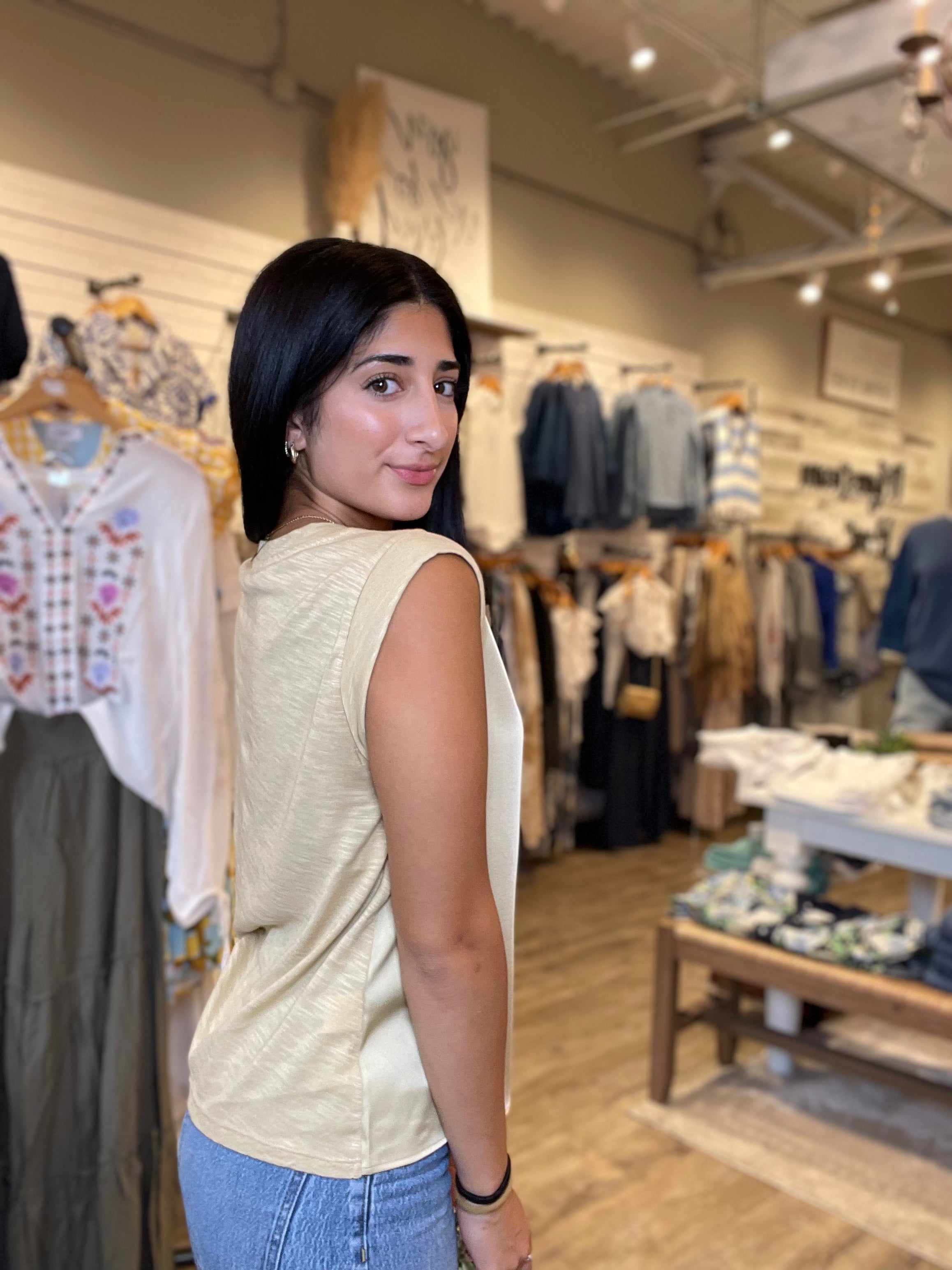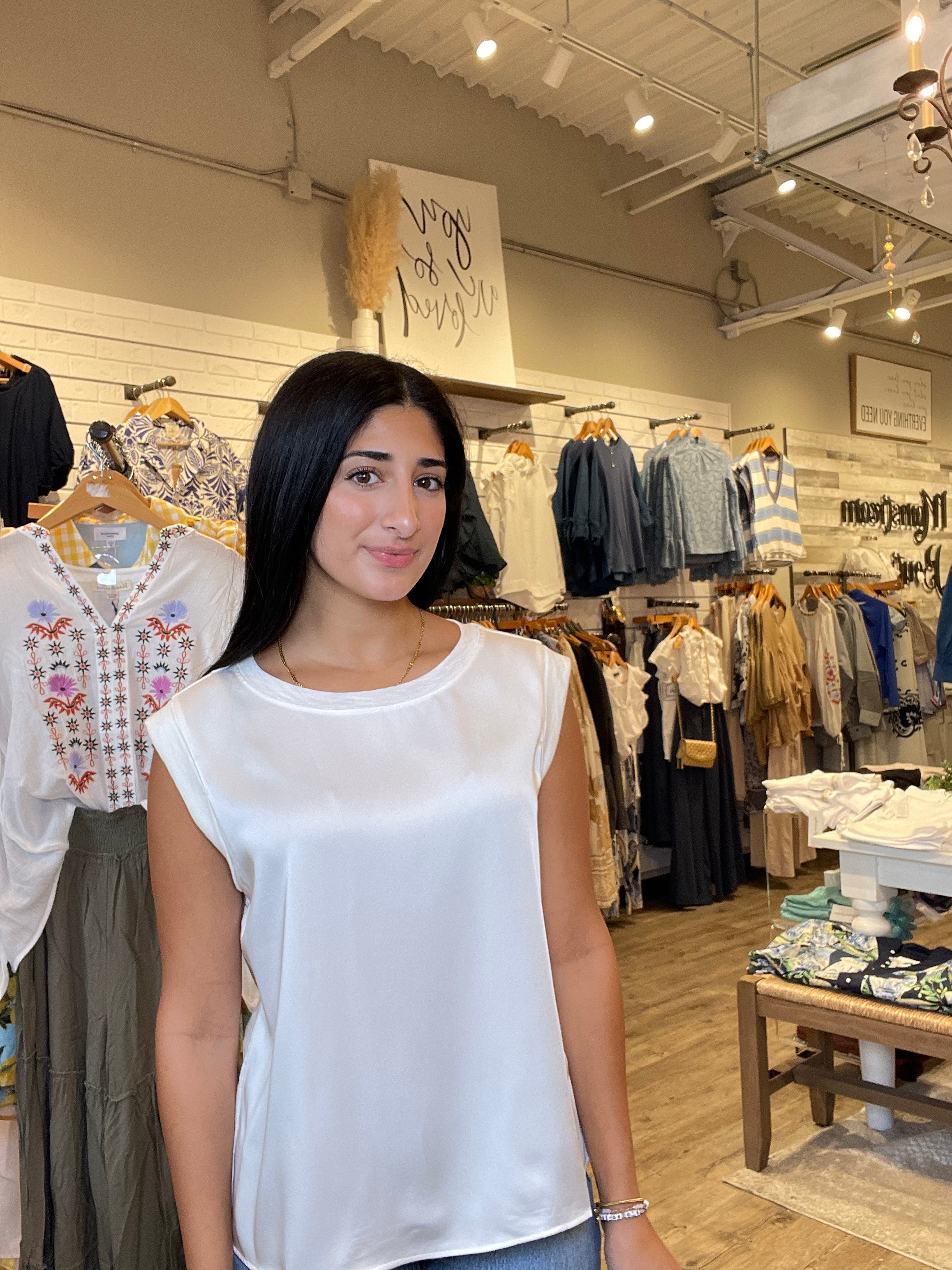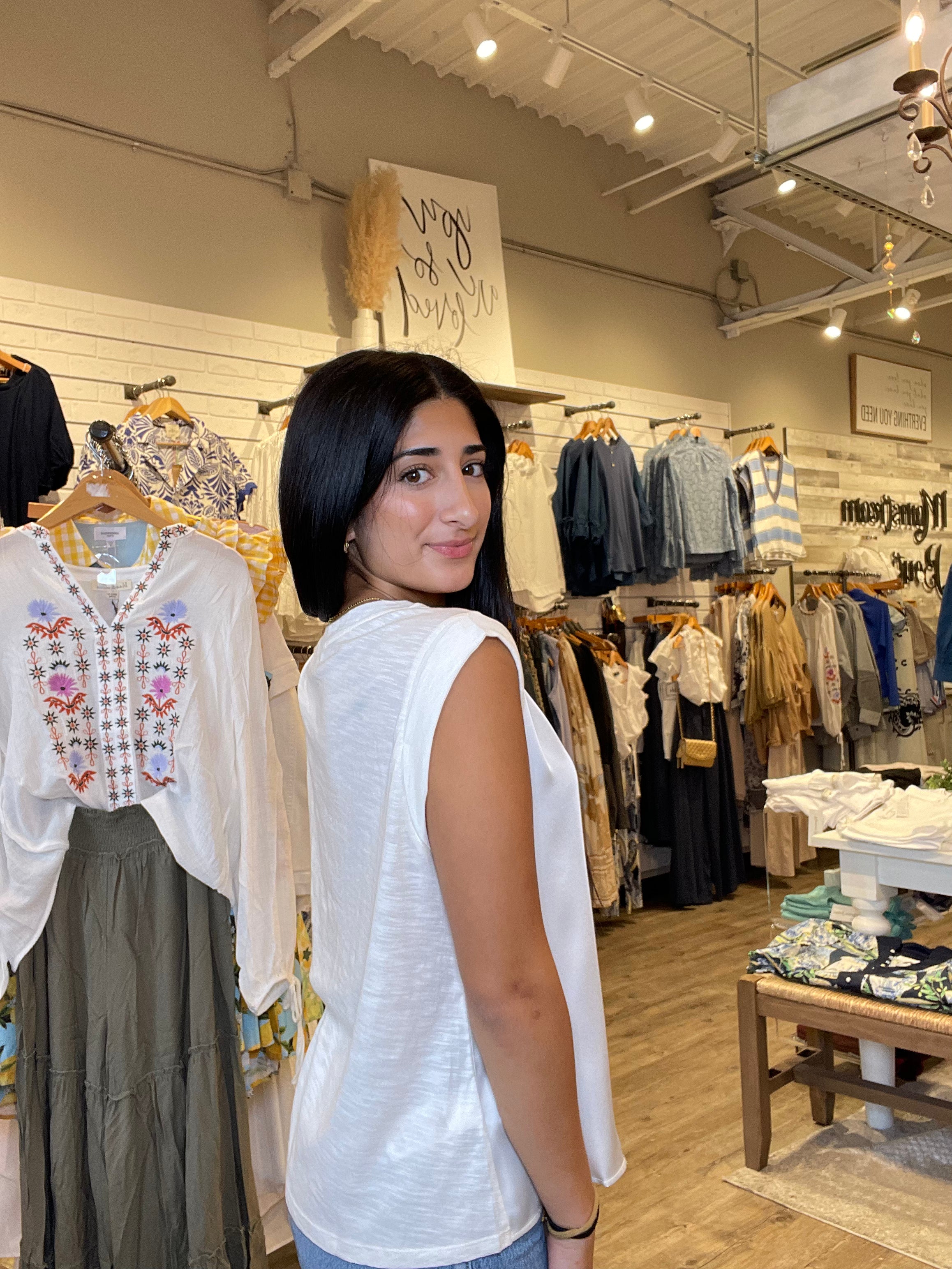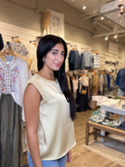 Where polish meets ease. This sleeveless top pairs a woven front for a clean, structured look with a soft knit back that moves with you. The result? A versatile piece that balances texture and comfort—effortlessly refined from day to night.
