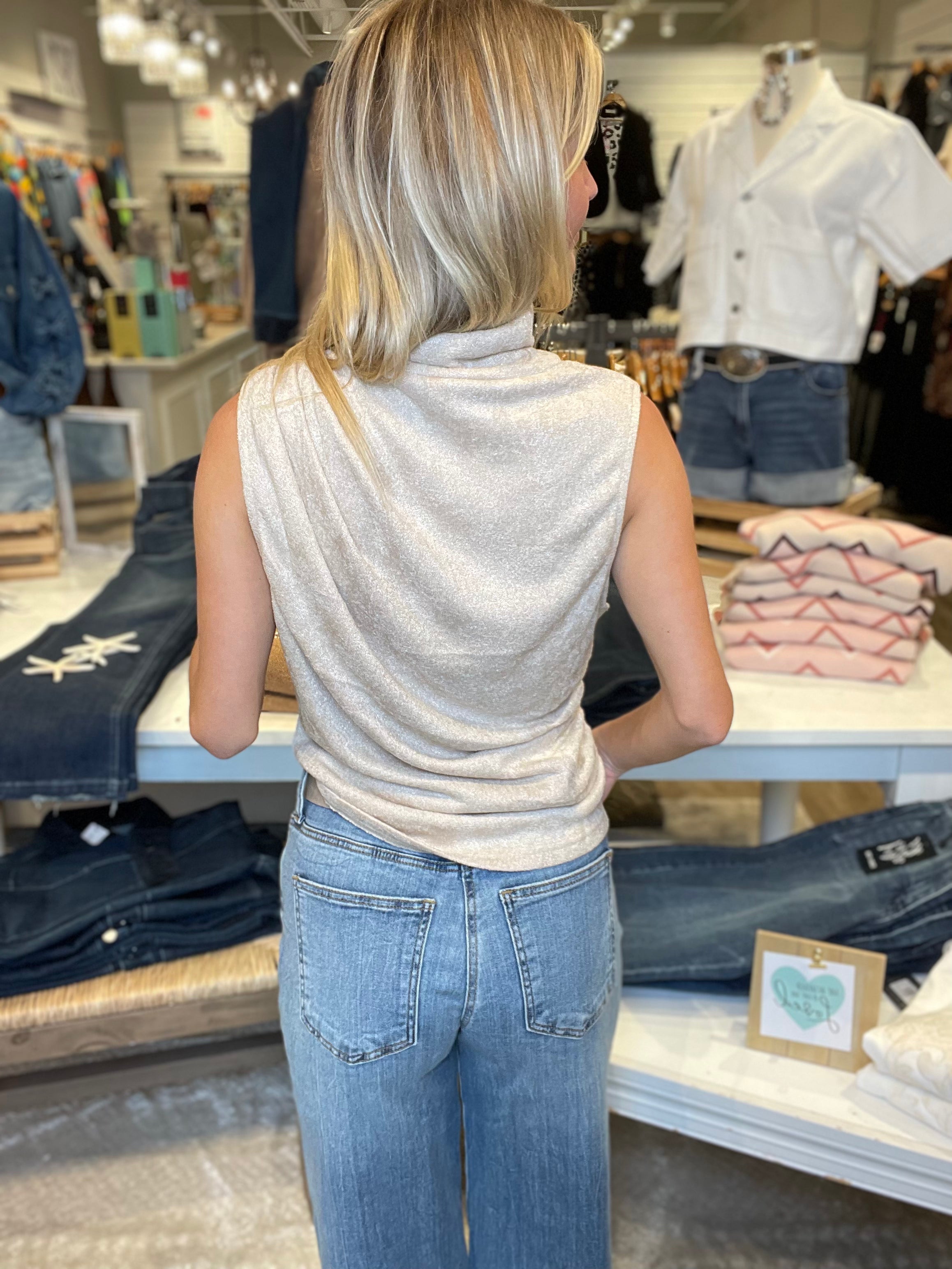 Elevate your everyday style with this chic ruched knit top. Crafted in a soft beige hue with subtle shimmer accents, this piece combines comfort and sophistication. The vertical ruching detail down the center front creates a flattering silhouette, while the mock neckline adds a touch of modern elegance. Perfect for layering or wearing on its own, this versatile top seamlessly transitions from casual days to evening outings.