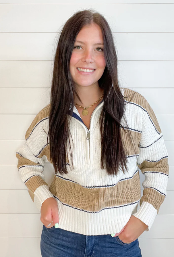 Stay cozy and stylish with our Striped Quarter-Zip Knit Sweater, the perfect mix of casual comfort and modern design. Featuring wide camel and cream stripes with subtle navy accents, this sweater offers a fresh take on classic knitwear. The quarter-zip neckline adds versatility, making it easy to wear zipped up for warmth or open for a relaxed look.