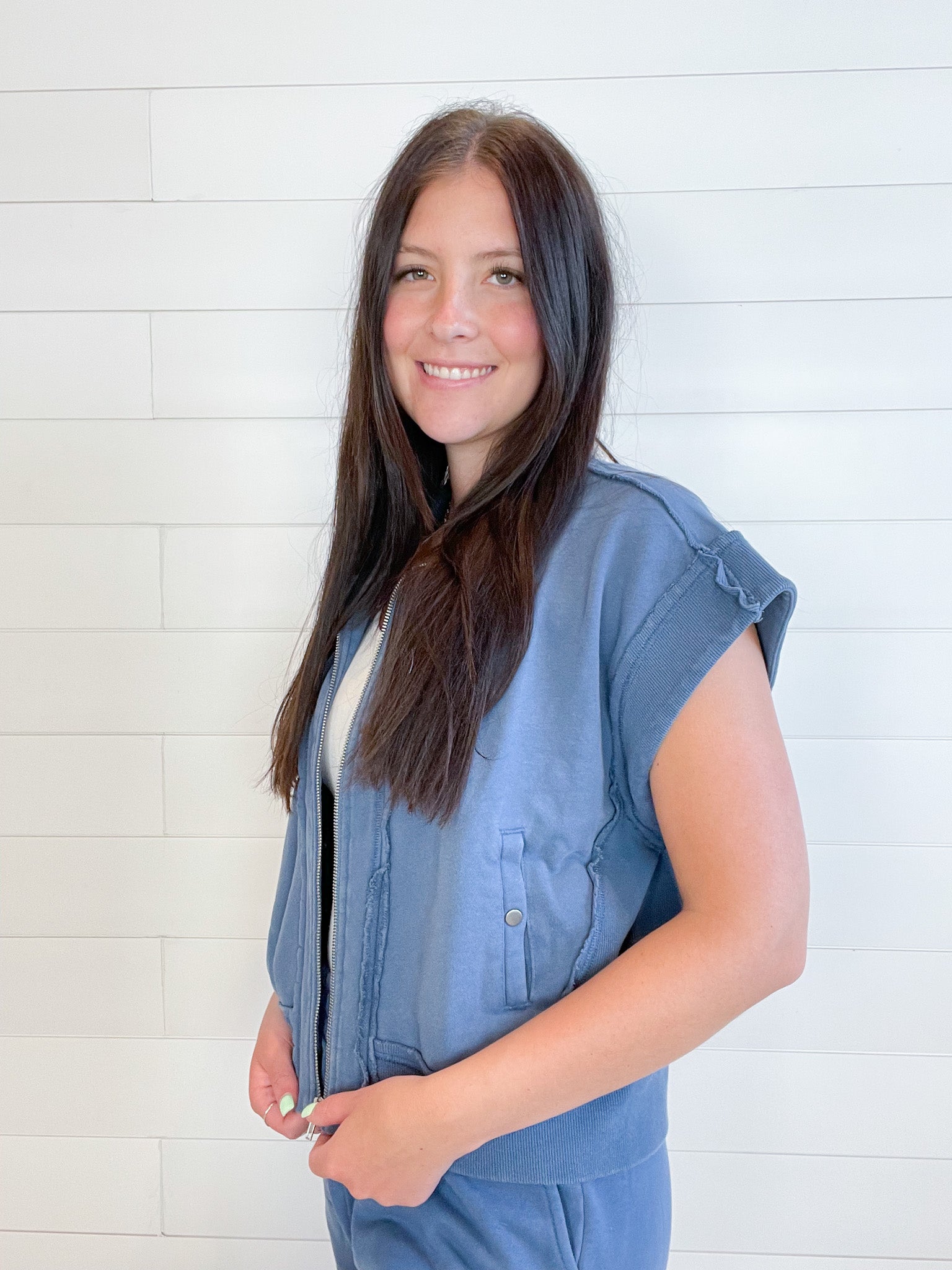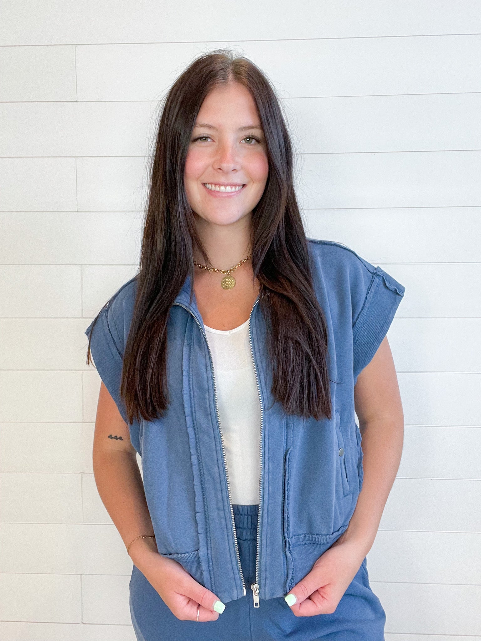 Power meets play in our Urban Edge Zip Vest. This sleeveless utility-style features a front zip closure, notched collar, raw-edged cap sleeves, and adjustable drawstring waist for a tailored yet relaxed fit. Finished in a soft washed blue cotton blend, it delivers laid-back attitude with effortless structure β ideal for everyday cool.